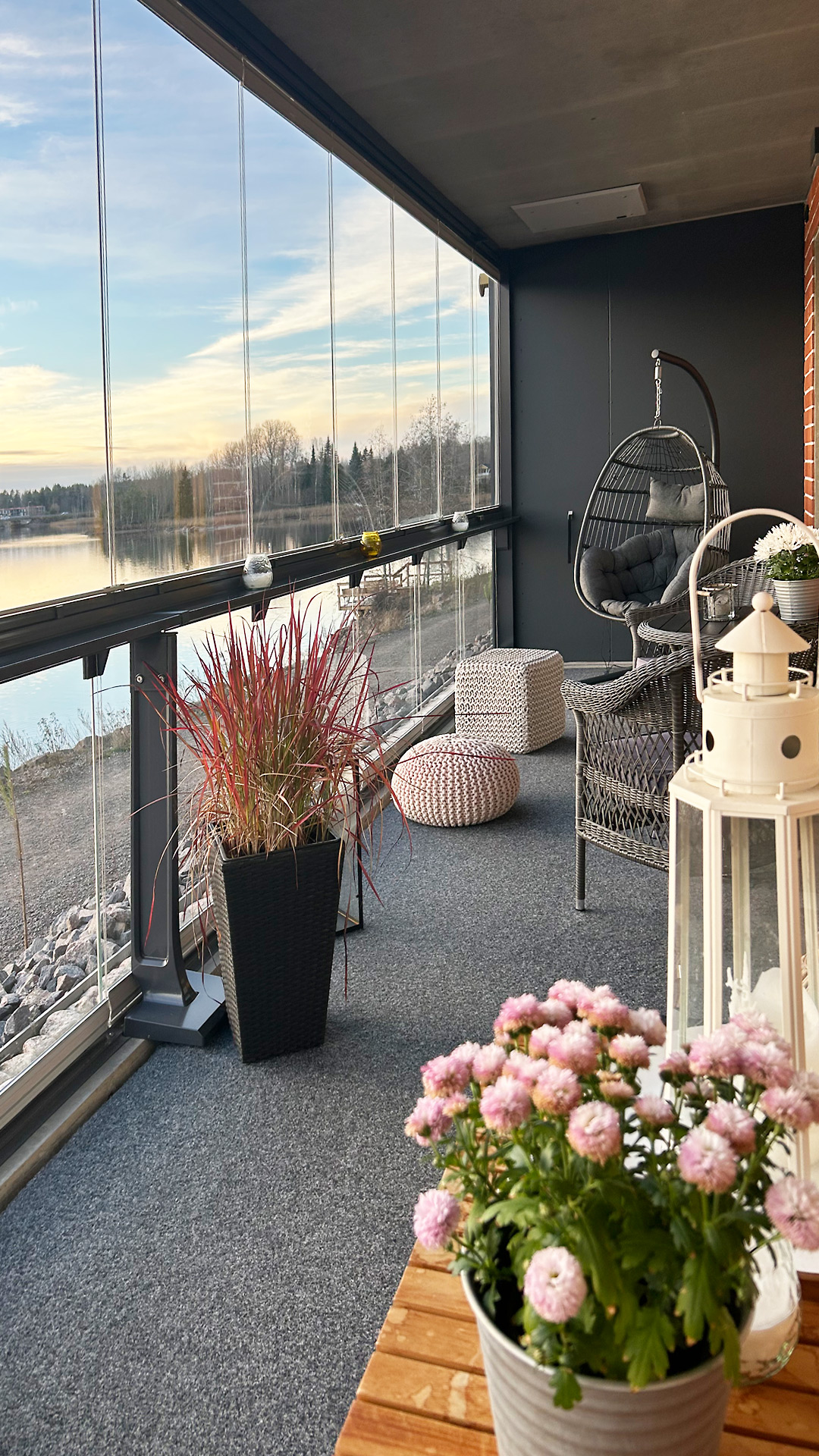 Asunnossamme on kolme huonetta ja keittiö sekä sauna, kylpyhuone ja kaksi wc:tä. Lisäksi meillä on koko asunnon levyinen lasitettu parveke, josta pääsemme ihailemaan kaunista maisemaa ja auringonlaskua. Kesäaamuisin se on paras paikka nauttia aamukahvit.