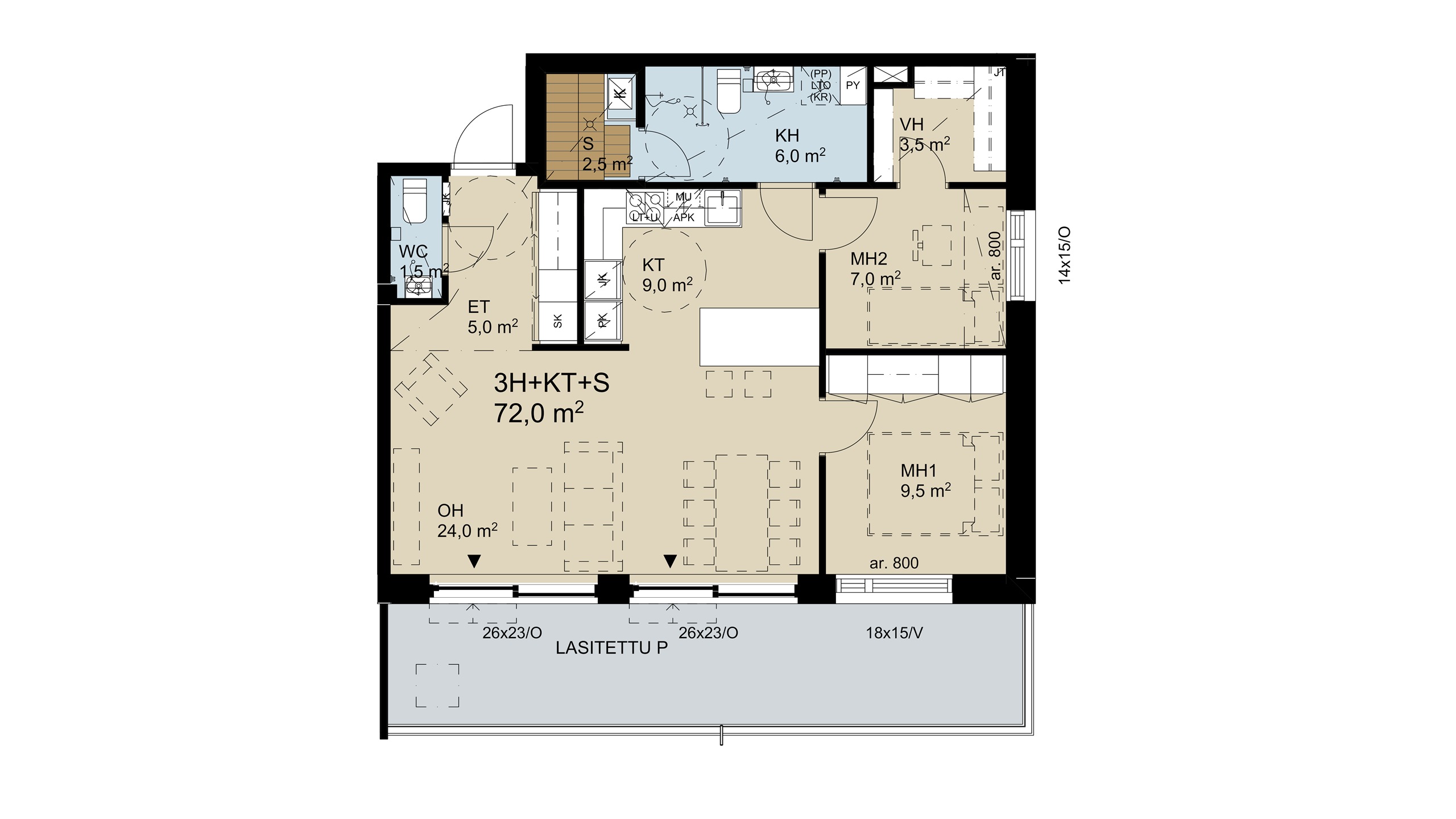 Pohjaratkaisussa ihastuimme siihen, että asunnon neliöt on sijoitettu sinne, missä niitä tarvitaan. Hukkaneliöitä ei ole esimerkiksi kylpyhuoneessa, vaan tarvittava tila on keittiössä ja olohuoneessa – juuri niissä paikoissa, joissa kotona vietetään eniten aikaa. Tämän paremmin pohjaratkaisu ei voisi toimia, vaan 72 neliötä on laitettu fiksusti käyttöön.