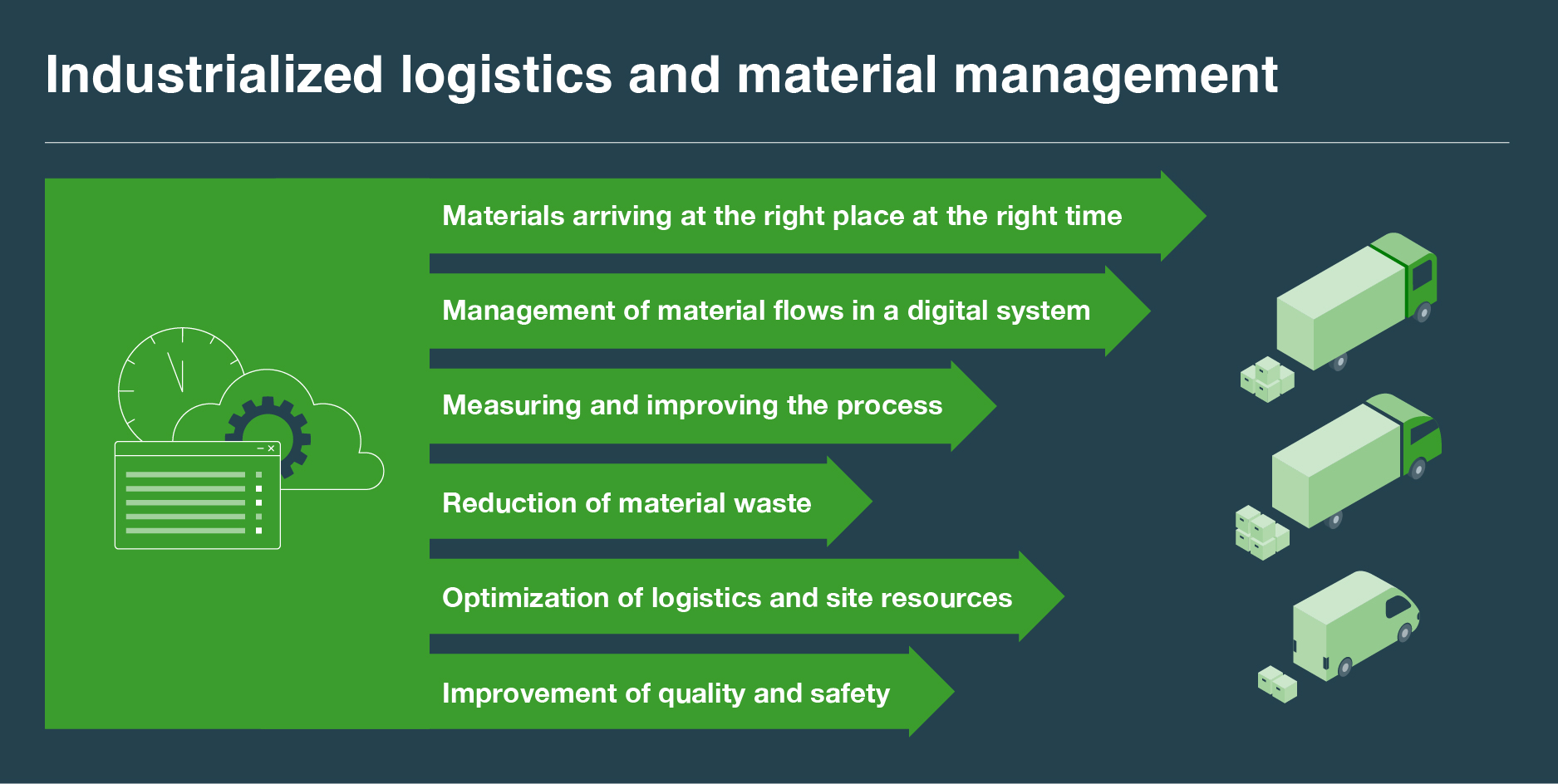 In takt time production, projects are divided into manageable and trackable sections, integrating other areas of production as well. Using a takt time alone isn’t enough for excellent project management – industrial-level material management, logistics, and prefabrication are also essential. YIT’s project management model is user-friendly, scalable, and continuously evolving. We work closely with our partner network to enable long-term development of construction practices.