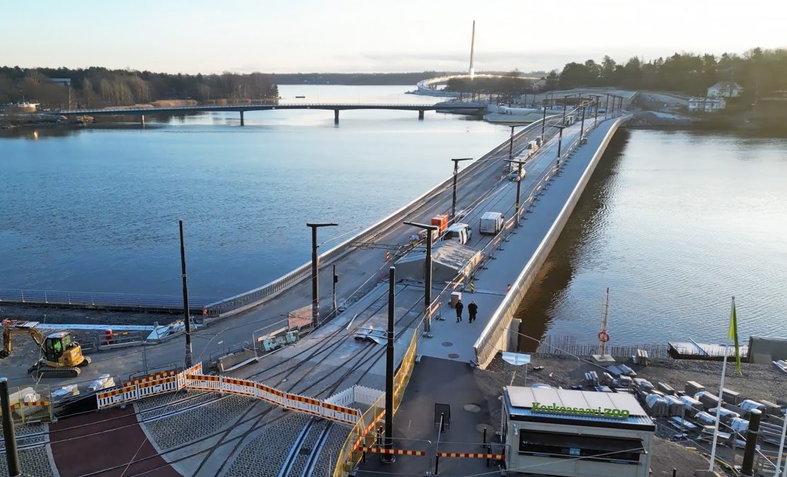 Located between Kalasatama’s Nihdi and Korkeasaari, Finkensilta bridge is designed for pedestrians, cyclists, and tram traffic. The bridge is approximately 293 meters long and 18 meters wide. It forms part of the the Cronw Bridge light rail connection, which also includes two other bridges: Merihaansilta, connecting Hakaniemi and Nihdi, and the Crown Bridge, which leads from Korkeasaari to Laajasalo.