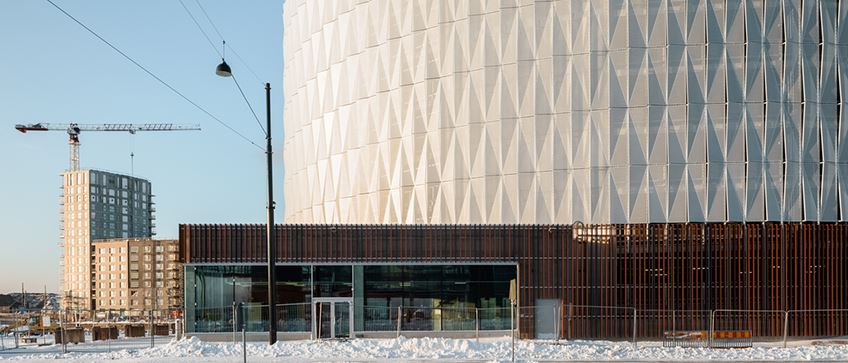 The project comprised a parking facility with approximately 730 parking spaces and a lobby. Work began in January 2020 with massive bored pile construction due to the challenging foundation. We drilled around 300 bored piles of approximately 30 m in length and 220 mm or 230 mm in width. We began setting up elements towards the end of April. There is a hollow tower-like structure at the centre of the construction that works to stiffen it. In the winter, it will also serve to remove snow piling up on the roof.