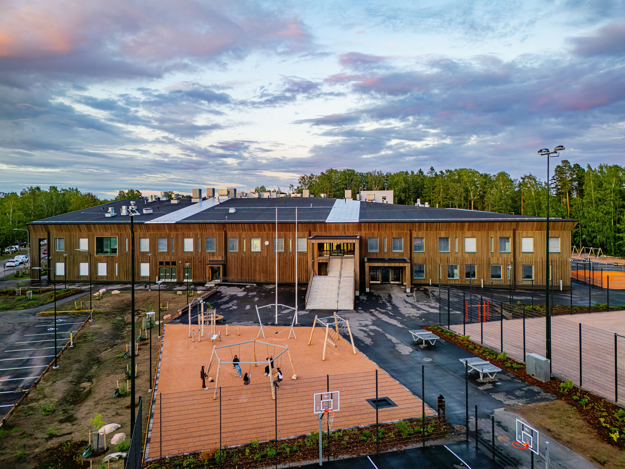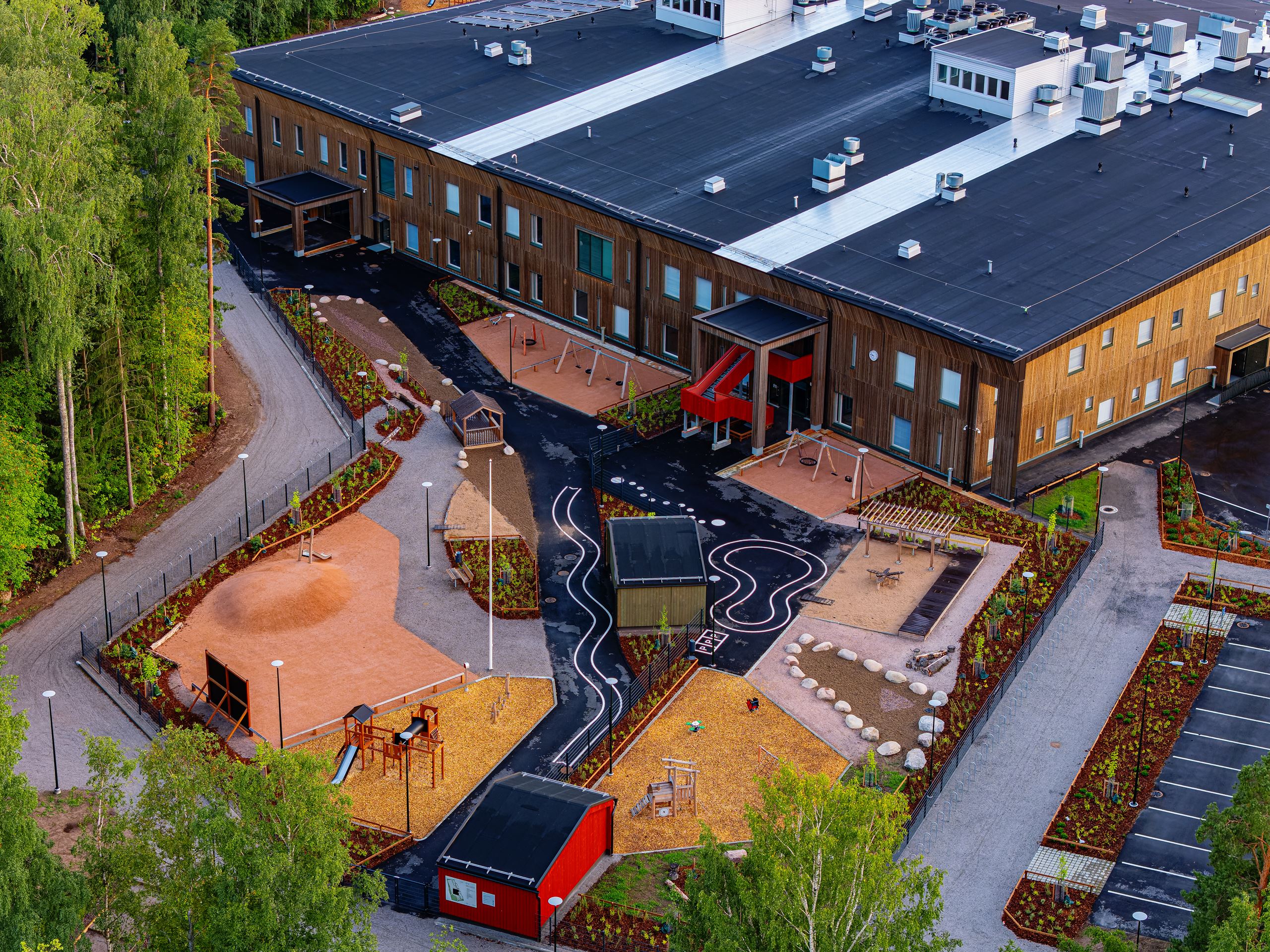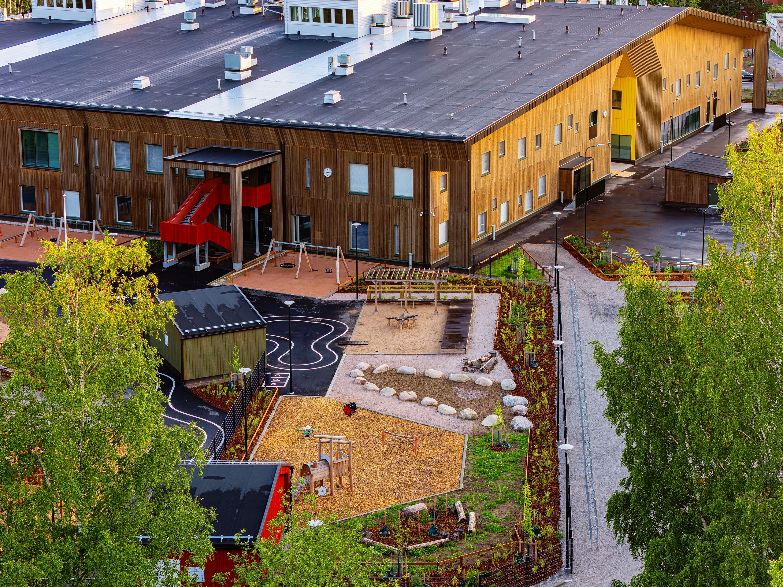 The gross area of the wooden school and daycare centre property is over 12,000 m2. The school accommodates 990 students and 110 staff members. There is also capacity for 168 children in early childhood education.