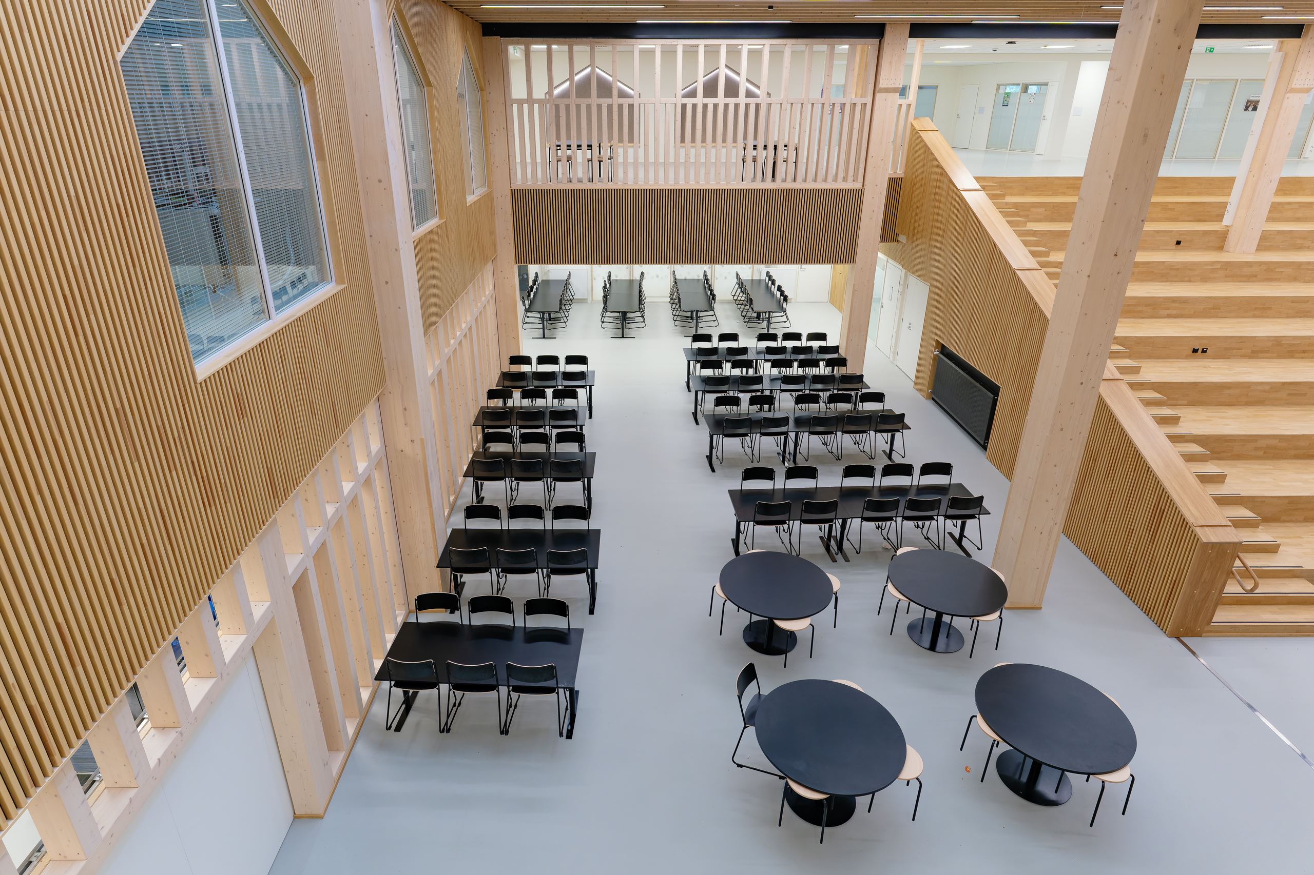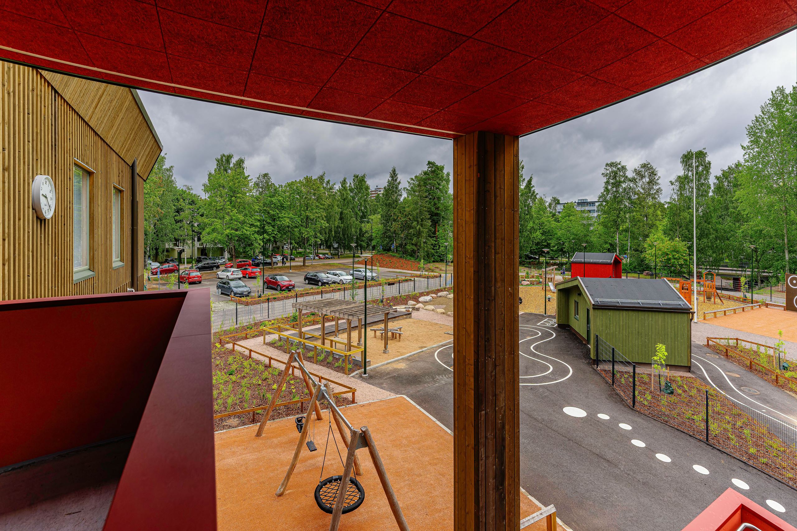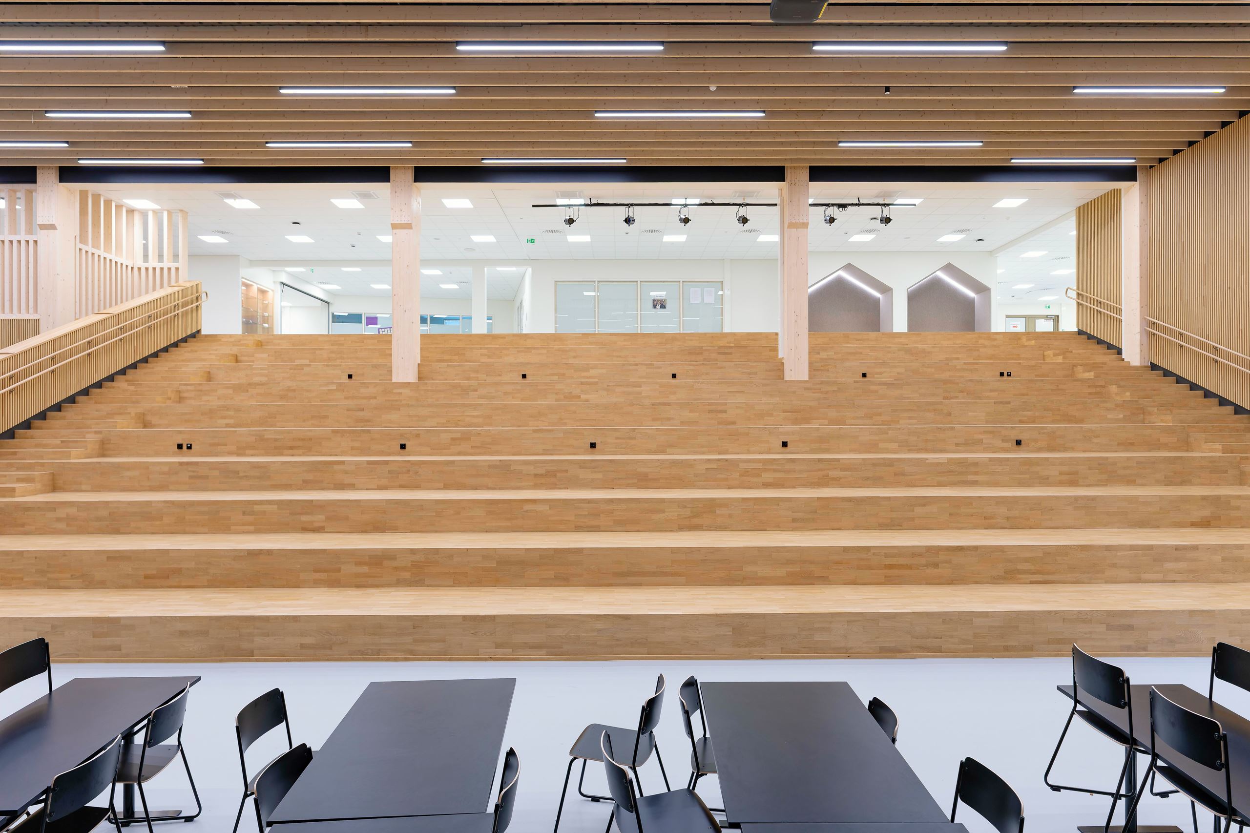The gross area of the wooden school and daycare centre property is over 12,000 m2. The school accommodates 990 students and 110 staff members. There is also capacity for 168 children in early childhood education.