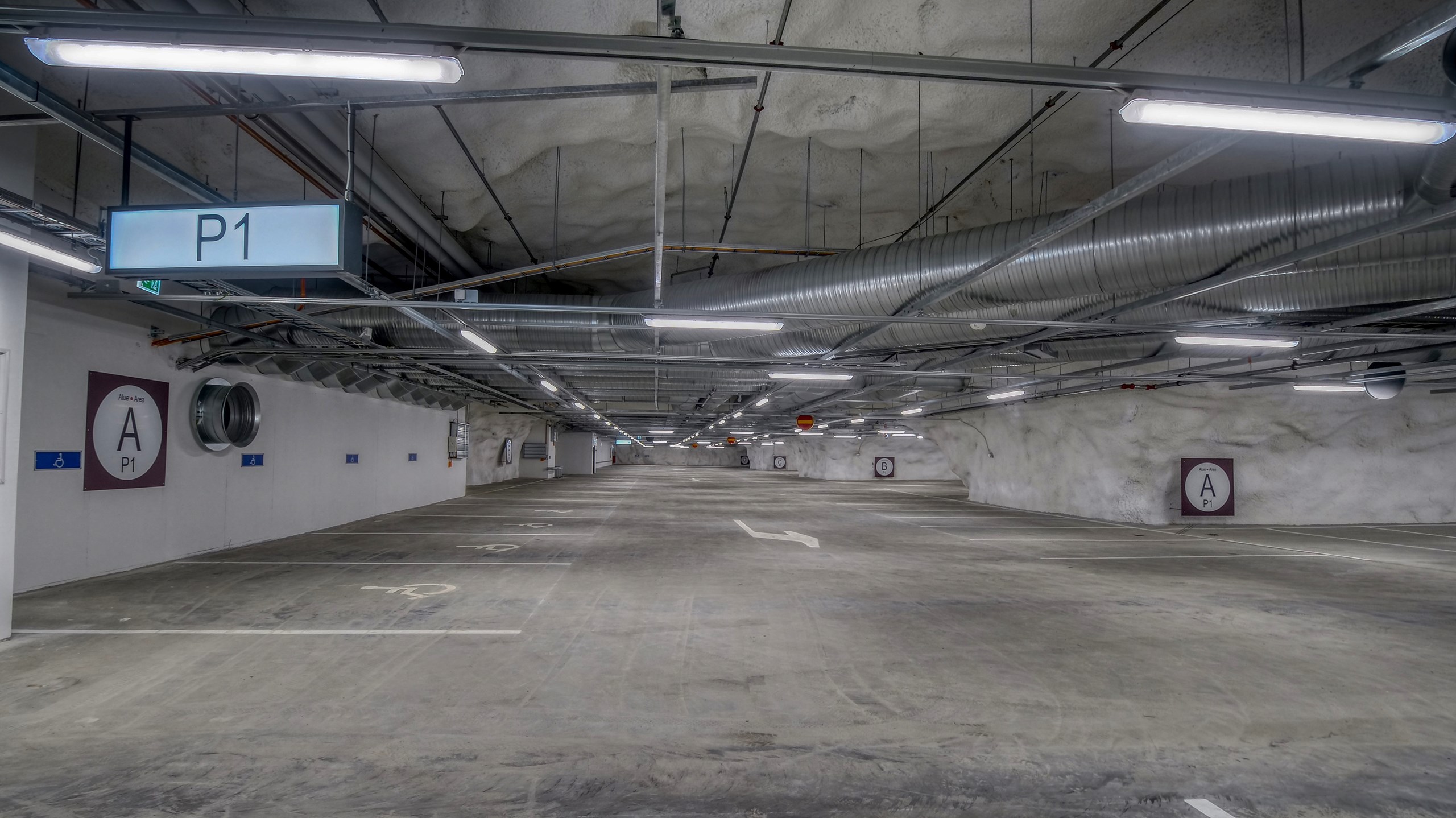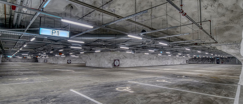 The project was realised as a turnkey contract, which means that it included all the phases of the contract from planning and design to construction. The construction included an access tunnel and three vertical shafts. Special challenges included fitting the structures of the concrete tunnels underground, connecting the parking hall to the structures of the adjoining Hotel Scandic and the underpinning of existing district heating piping in the excavation area.