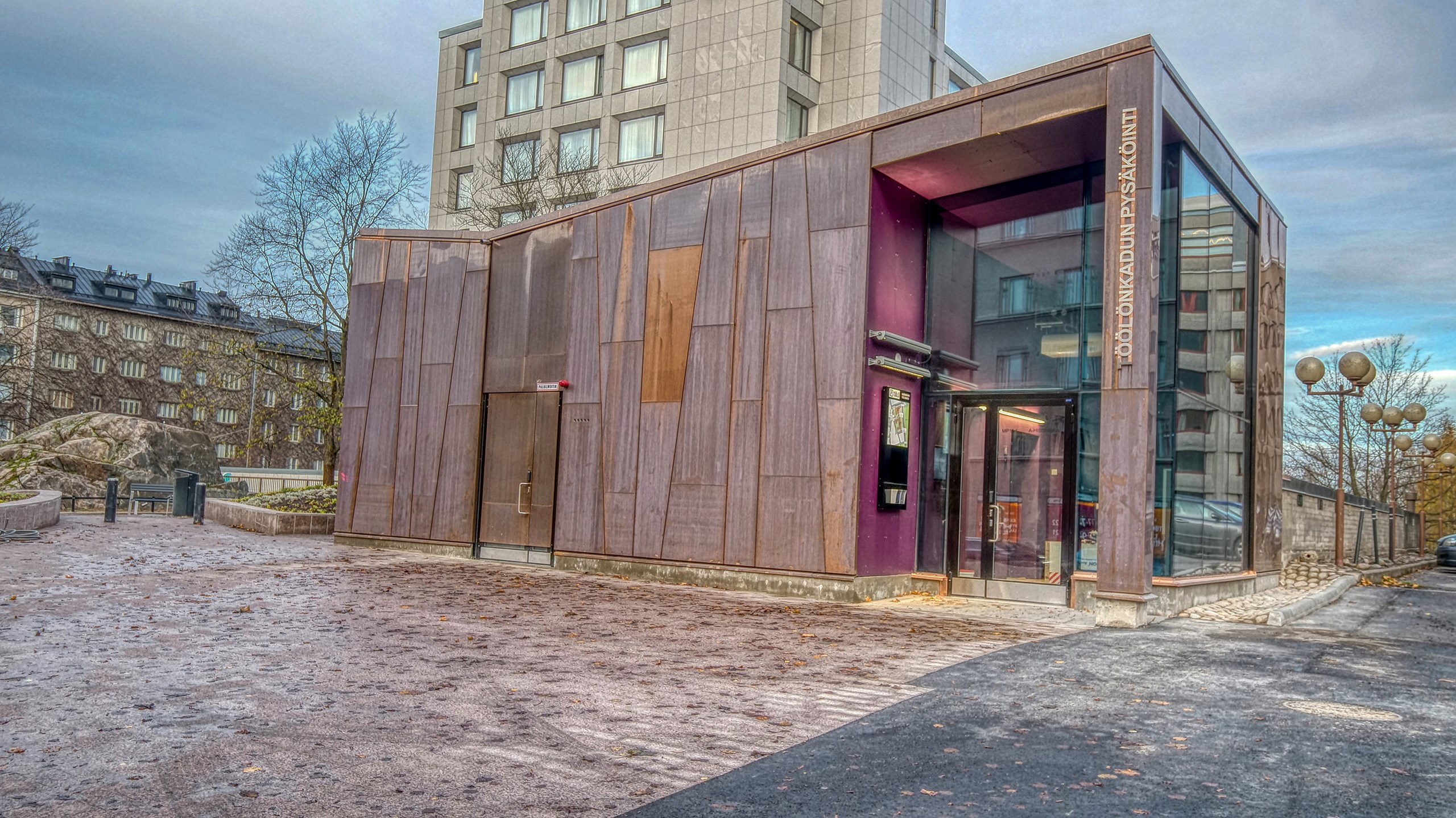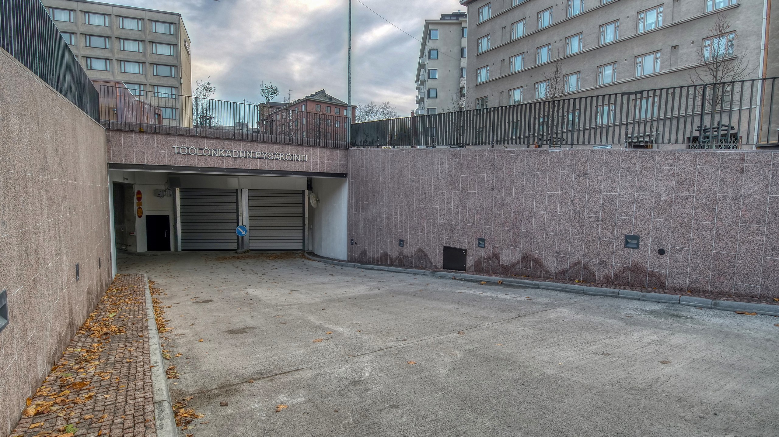 The Töölönkatu parking hall is located in a central location in the Helsinki neighbourhood of Töölö, in the proximity of Mannerheimintie, one of the main thoroughfares of the city. The parking hall is partially underneath the large hotels along Mannerheimintie. The entrance to the parking hall is from Töölönkatu by the Kivelä park. The parking facility consists of four parking halls with parking spaces on three levels.