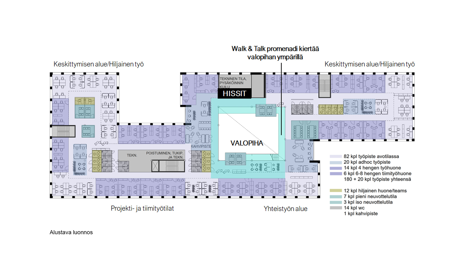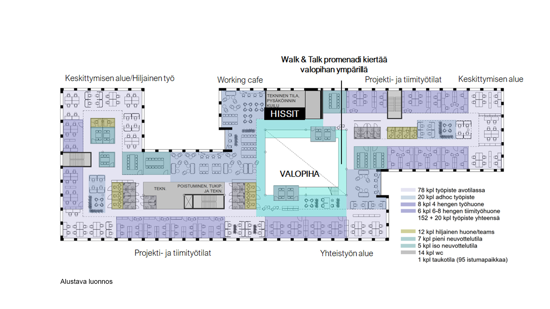 Skatta 14 offers high-quality premises in the culturally and historically valuable Katajanokka maritime area, which is part of the expanding business area of the Helsinki city centre. The block breathes city life by opening up to its surroundings with squares, restaurants and terraces. The architecture of Skatta 14 is based on natural tones, wood and glass, and the facade is made of rough red brick, which is characteristic of the area. The large windows of the office spaces and the building's glass-covered atrium fill the workspaces with natural light from all directions. The large floor plans, up to 1,700 m², support different types of work models and enable smooth collaboration and meetings.