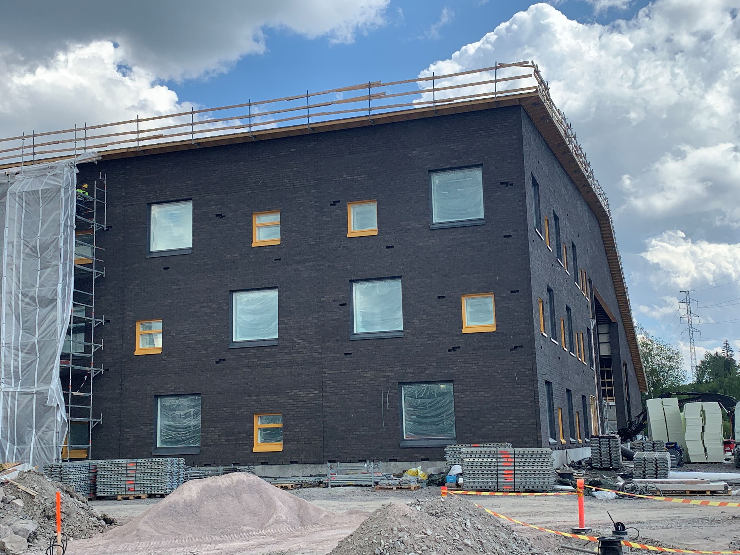 Kesän kunniaksi rakennuksen ympäriltä on purettu sääsuojatelineitä pois ja komea julkisivu paljastuu pikkuhiljaa. Muuraustyöt ovat valmistuneet ja metsän puoleisella sivulla tehdään vielä levyverhouksia.