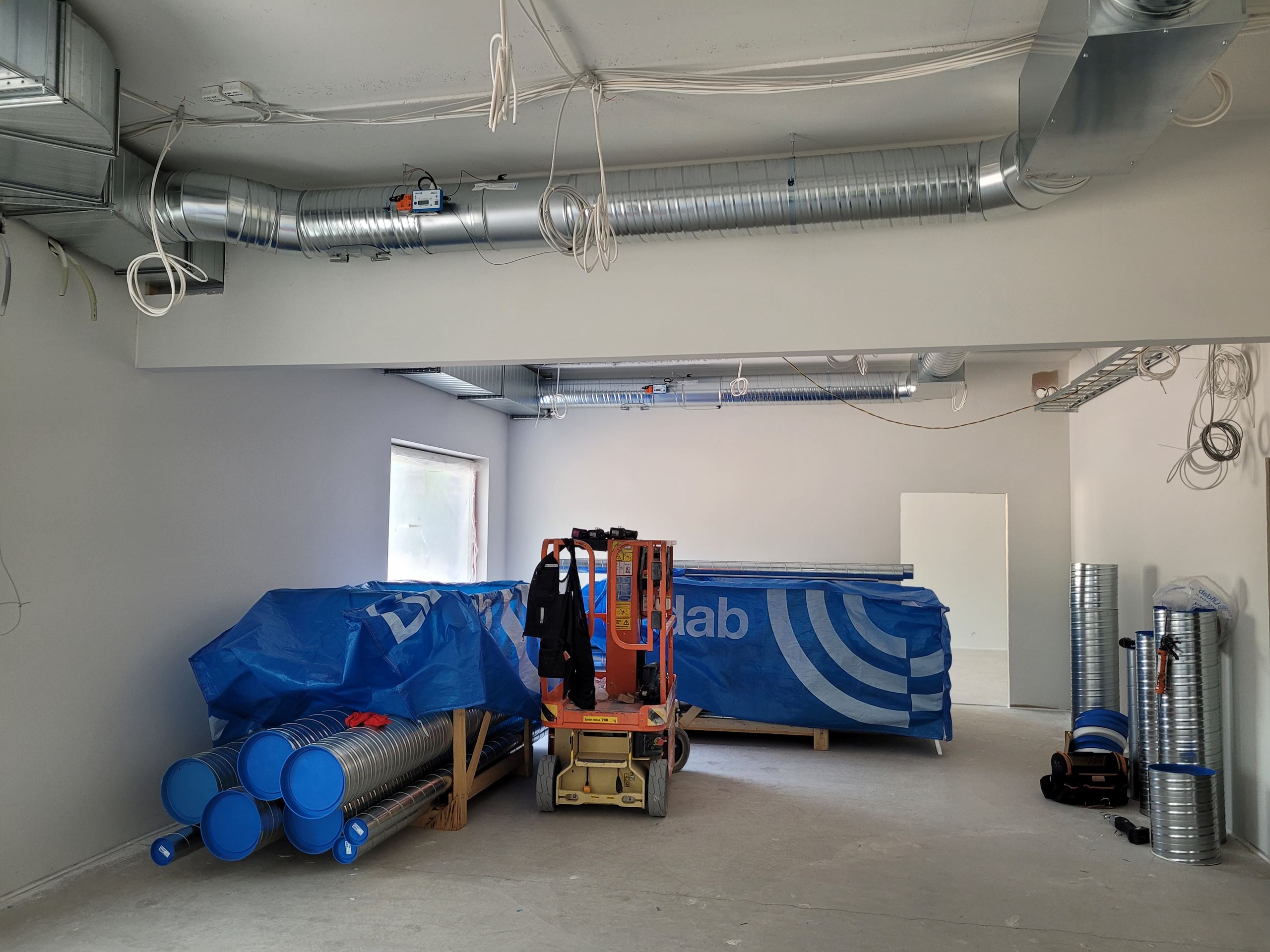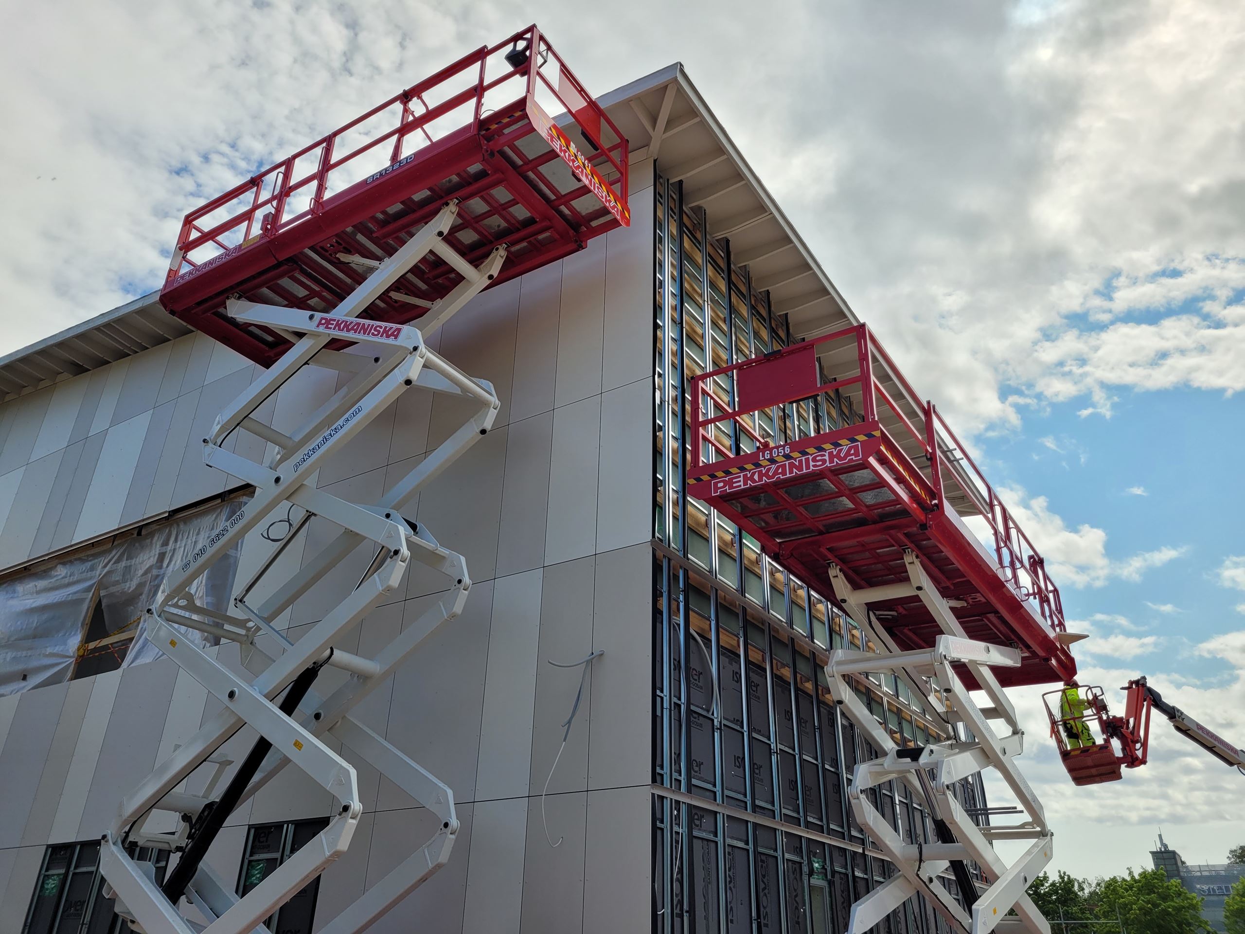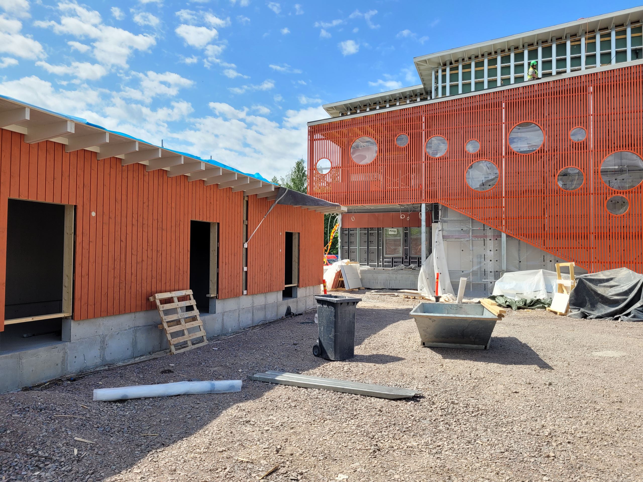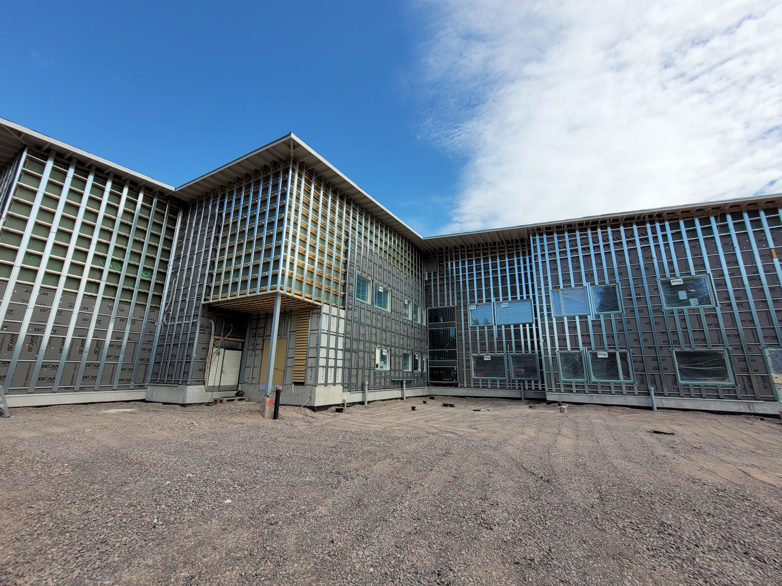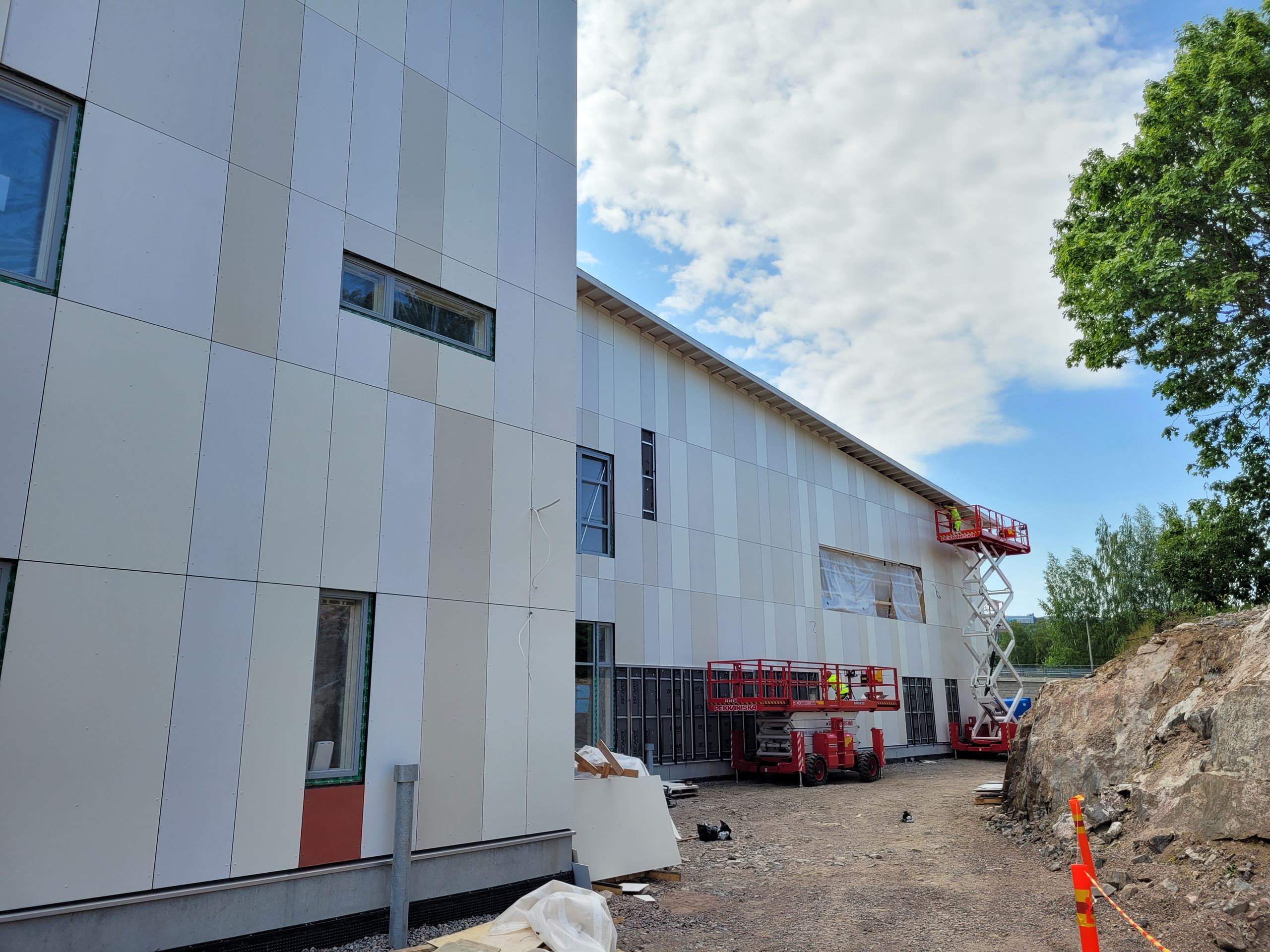 Tällä hetkellä ulkona suoritetaan julkisivulevytystöitä ja pihoja profiloidaan. Vesikattotyöt ja varastorakennukset ovat valmistumassa.