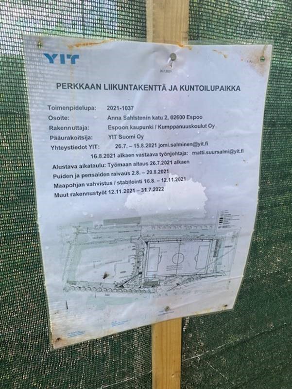 Perkkaanniityn liikuntakentän työmaatiedote 1.6.2022
