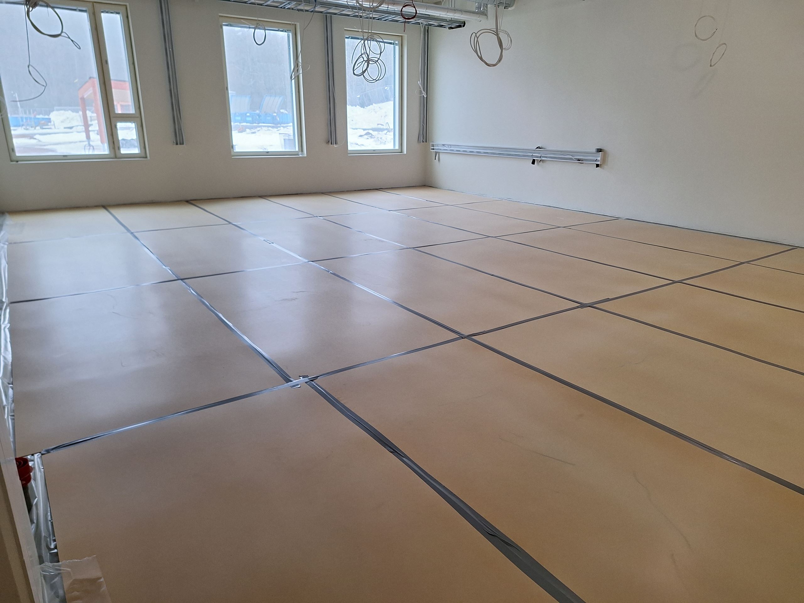 Inomhus har vi installerat bland annat möbler, metalldörrar, trädörrar, undertak och golvlistning. Installationer av vikväggar på C- och D-blocken har påbörjats. I trapphusen har trappräcken och ledstänger installerats och mattarbete utförts. Golvytbehandlingen i klassrum på D-sektionen är färdiga. I februari påbörjas installationen av teknisk arbetsutrustning. Nu har en så kallad myntmatta installerats i dessa utrymmen.