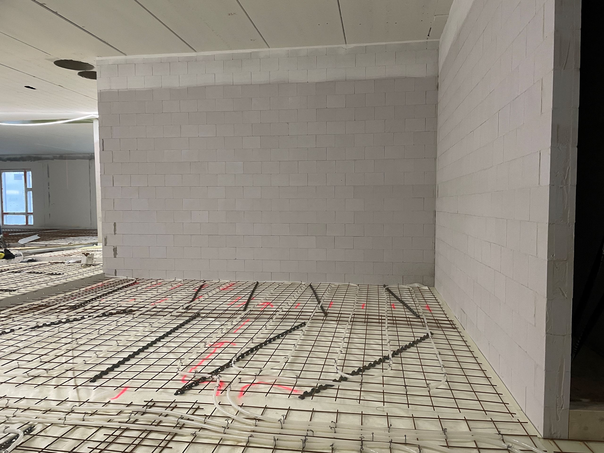 Inne i byggnaden fortsätter mellanväggsmurning, gipsväggarna samt puts- och målningsarbeten. I VVS-arbeten fortsätter rörarbeten, installation av golvvärmerör och el installationer. Dessutom har hopfällbara väggarnas stommar och gipsarbete mellan klassrummen blivit färdiga på block A. Nästa gjutning av betonggolv görs på första och andra våningarna på block B.