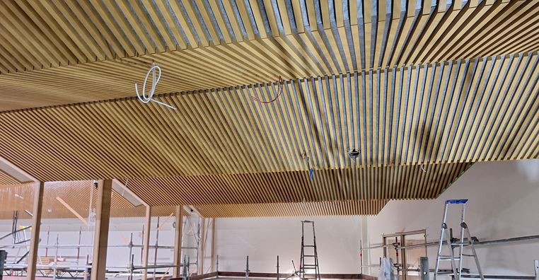 Inomhus har vi installerat bland annat möbler, metalldörrar, trädörrar, undertak och gjort listning, efterarbeten av målningsarbeten samt påbörjat installationer av utrustning. Installationer av vikväggar på C- och D-blocken är i gång. I trapphusen har installationen av räcken och ledstänger slutförts och mattläggningsarbeten har slutförts i alla trapphus förutom på D-blocket. Installation av tekniska arbetsmaskinerna är klar. Installationer av läktartrappan i centralhallen ska börja inom kort.