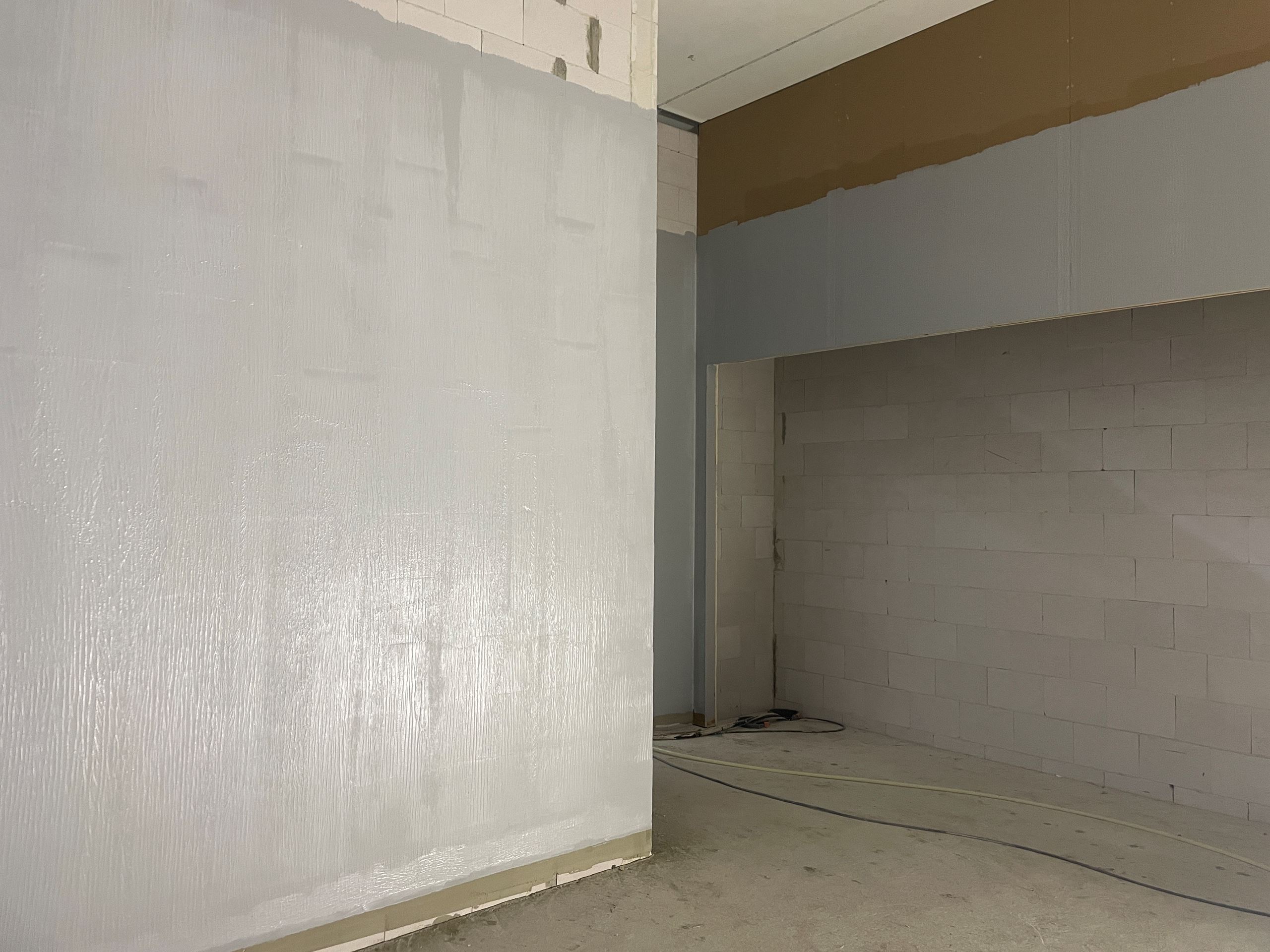 Inne i byggnaden fortsätter mellanväggsmurningarna samt puts- och målningsarbeten. Mellanväggsmurningen är på slutrakan och pågår på block C och D. Nästa gjutning av betonggolv görs i första våningen i gymnastiksalarna. Som en ny arbetsfas har vattenisolering- och kakelsättning påbörjats i köksutrymmena.