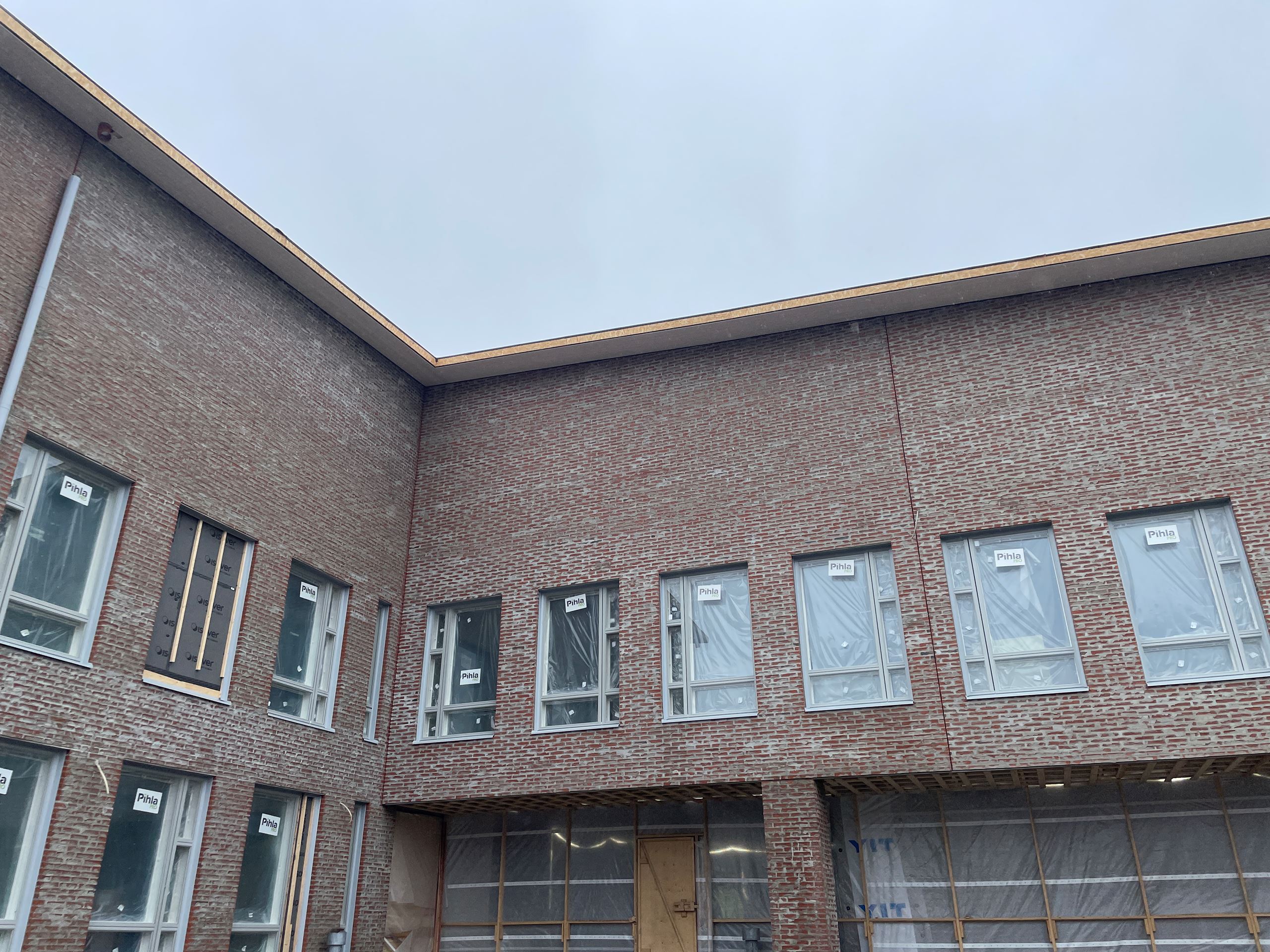 Rakennuksen julkisivulla muuraustyöt ovat siirtyneet B-lohkon puolelle. Telineasennus etenee muurauksen edellä, ja asennukset ovat käynnissä tällä hetkellä C-lohkolla. Maanrakennustöissä kaivetaan ja asennetaan pihaviemäreitä sekä tehdään täyttöjä.