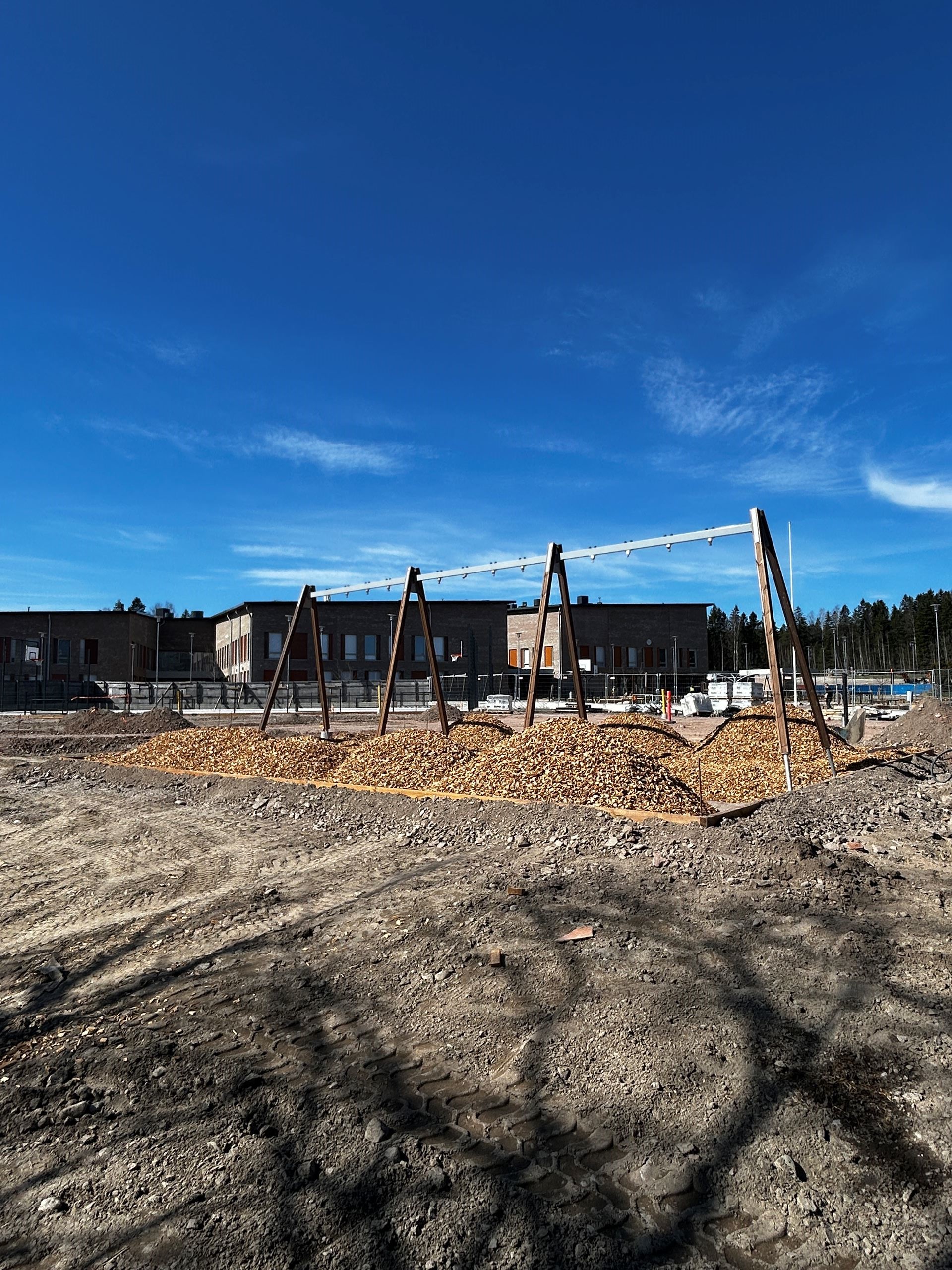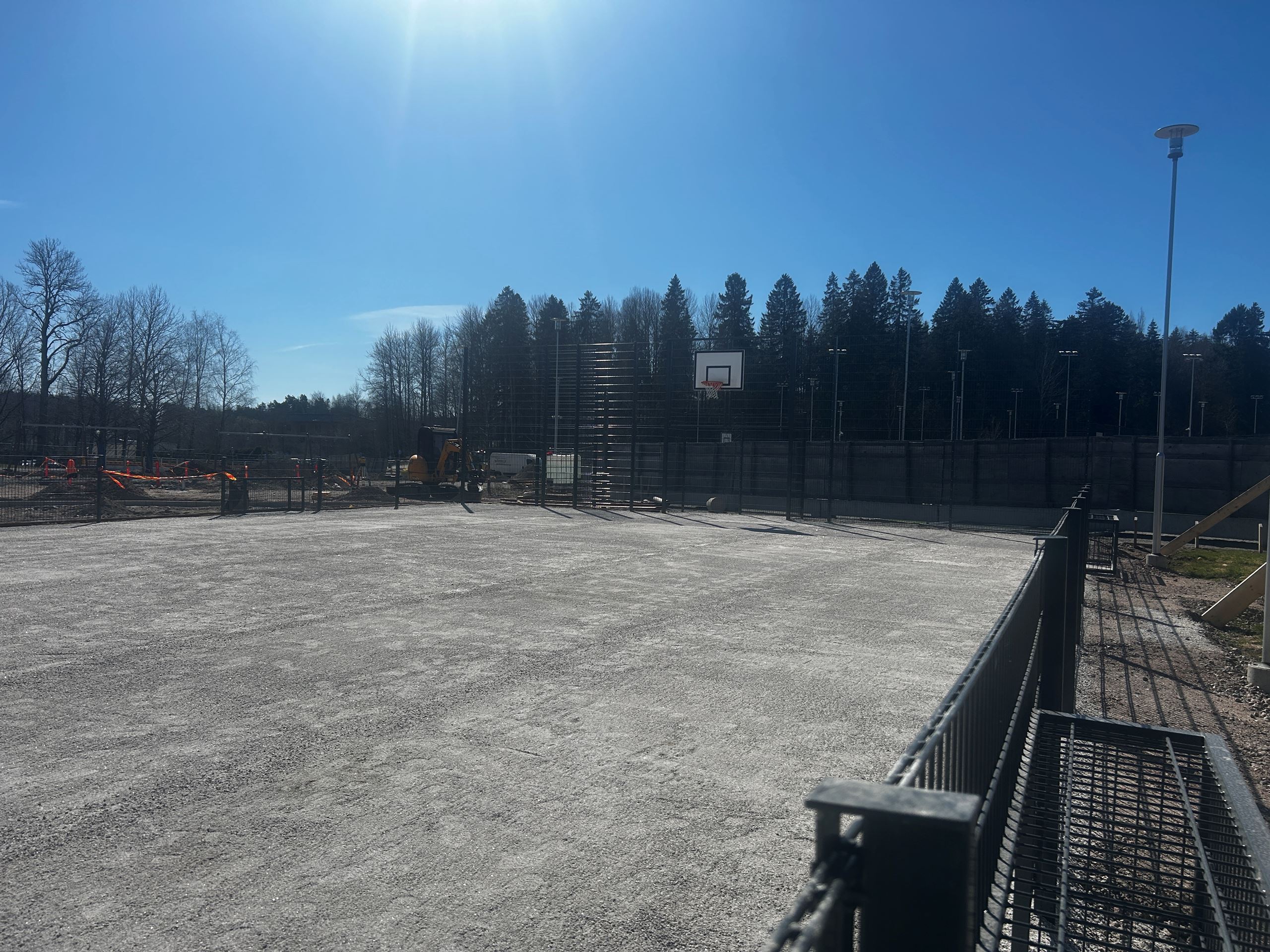 På Gesterbybågen pågår gårdsarbeten i flera olika skeden. I området har man bland annat monterat gungor, byggt träkanter runt gungorna, gjutit fundament till klätterpyramiden samt monterat kantstenar. Staketen vid spelarenan har monterats på plats. Härnäst inleds bland annat monteringen av konstgräs och uppförandet av klätterpyramiden.
