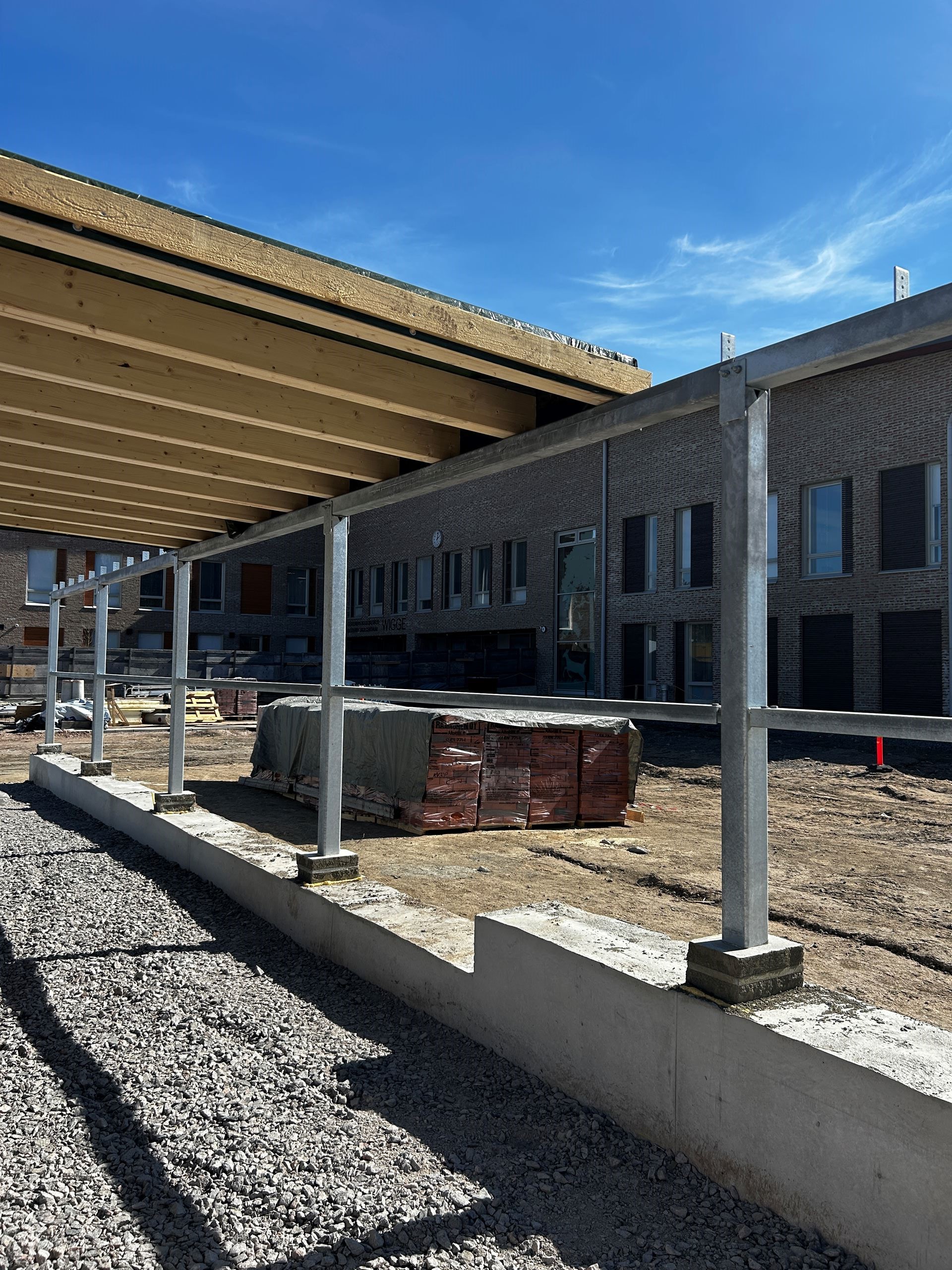 Odottelu-/pyöräkatoksen teräsrunko on asennettu paikoilleen, ja katoksen puutyöt on aloitettu. Sen jälkeen jatketaan katoksen muuraustöillä.