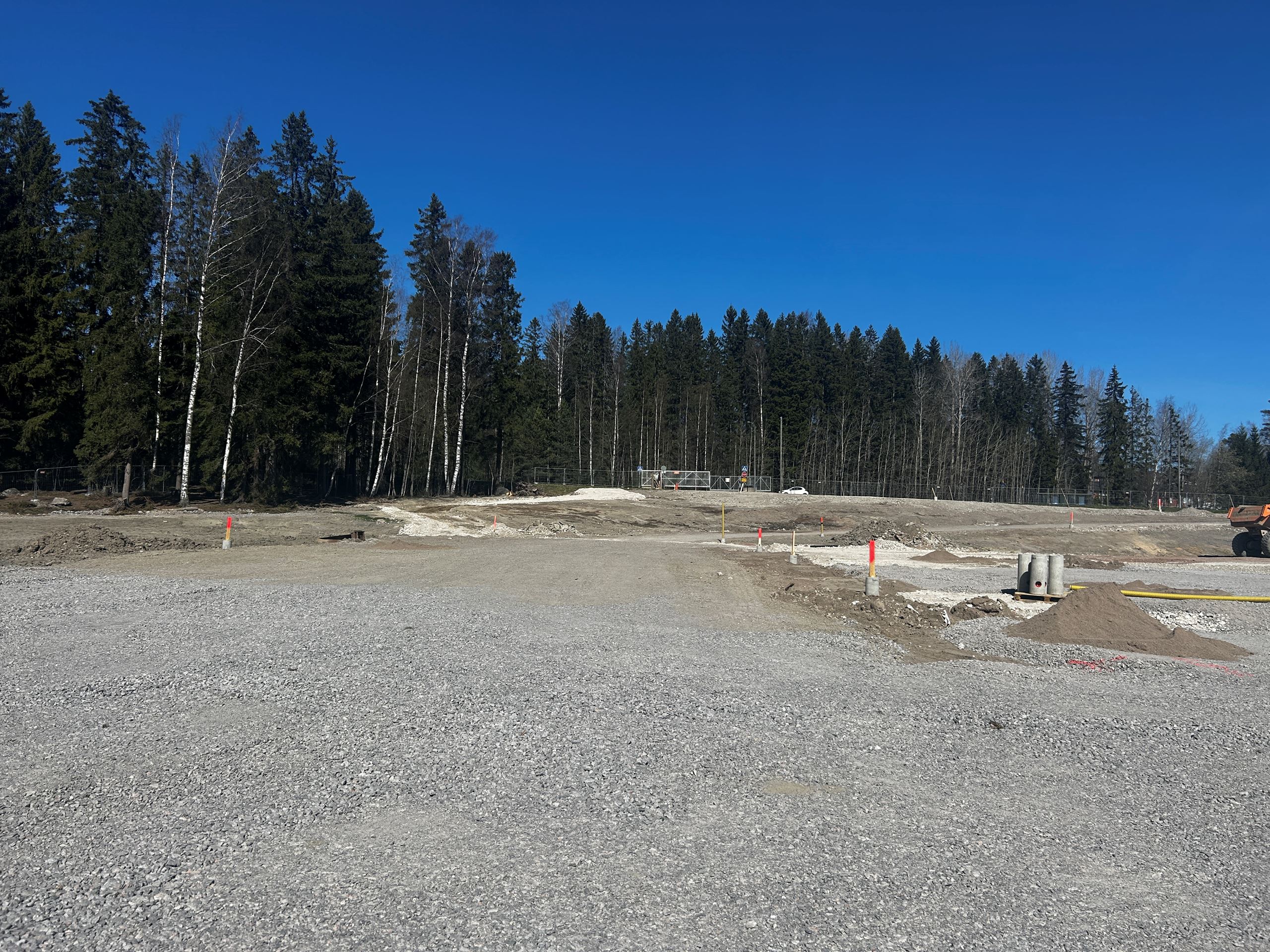 Markarbetena har slutförts på arbetsplatsområdet vid Gesterbybågen. Arbetena fortsätter fortfarande på byggarbetsplatsen vid Vilhelmsbergsvägen, bland annat med montering av belysningsfundament, installation av dagvattenrör och profilering.