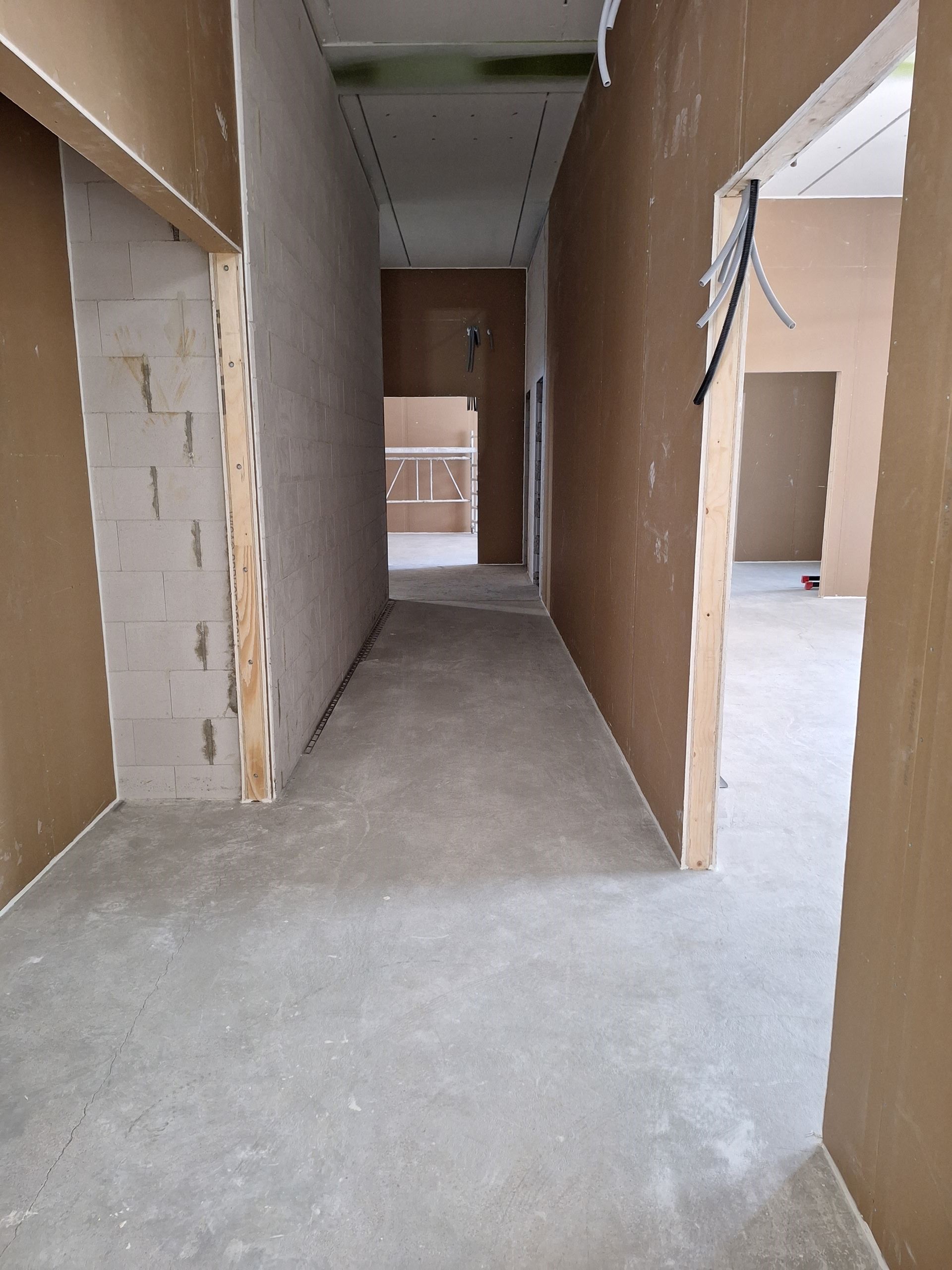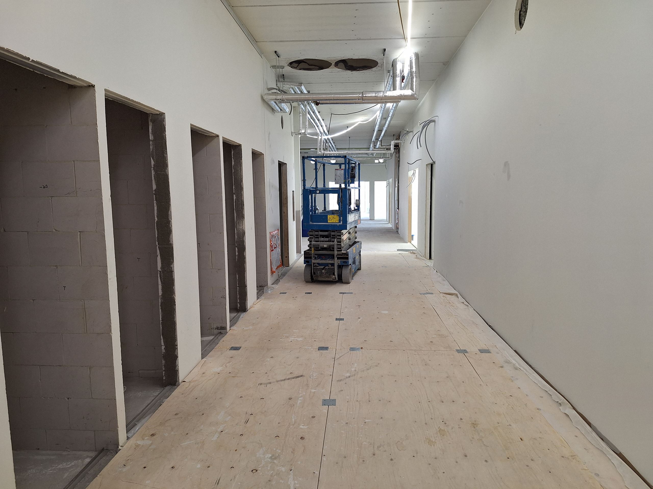 När det gäller betonggolv har gjutningar utförts i både C-blockets våningar och D-blockets andra våning i maj. Arbeten med gipsväggar, puts och målning fortsätter, liksom arbete med vattenisolering och kakelsättning i toaletterna. Nya arbetsmoment inkluderar akrylgolv i köksutrymmen samt installation av hiss i början av juni. Då kommer hissen på block A att