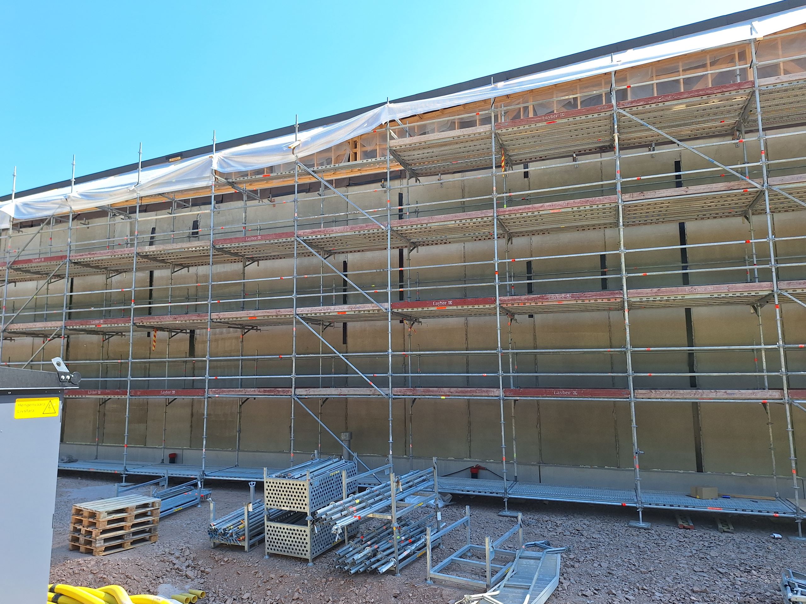 Vesikatolla pintakermien asennus on käynnissä. Lisäksi rakennuksen katolle on asennettu aurinkopaneeleja. Kulkusiltoja rakennetaan 3.kerroksen ullakkotiloissa. Julkisivulla muuraus- ja villoitustyöt ovat tällä hetkellä käynnissä D-lohkolla. Telineiden osalta seuraavaksi aletaan purkaa telinettä huoltopihalta eli E ja F -lohkojen puolelta julkisivua, jossa muuraustyöt ovat valmistuneet.