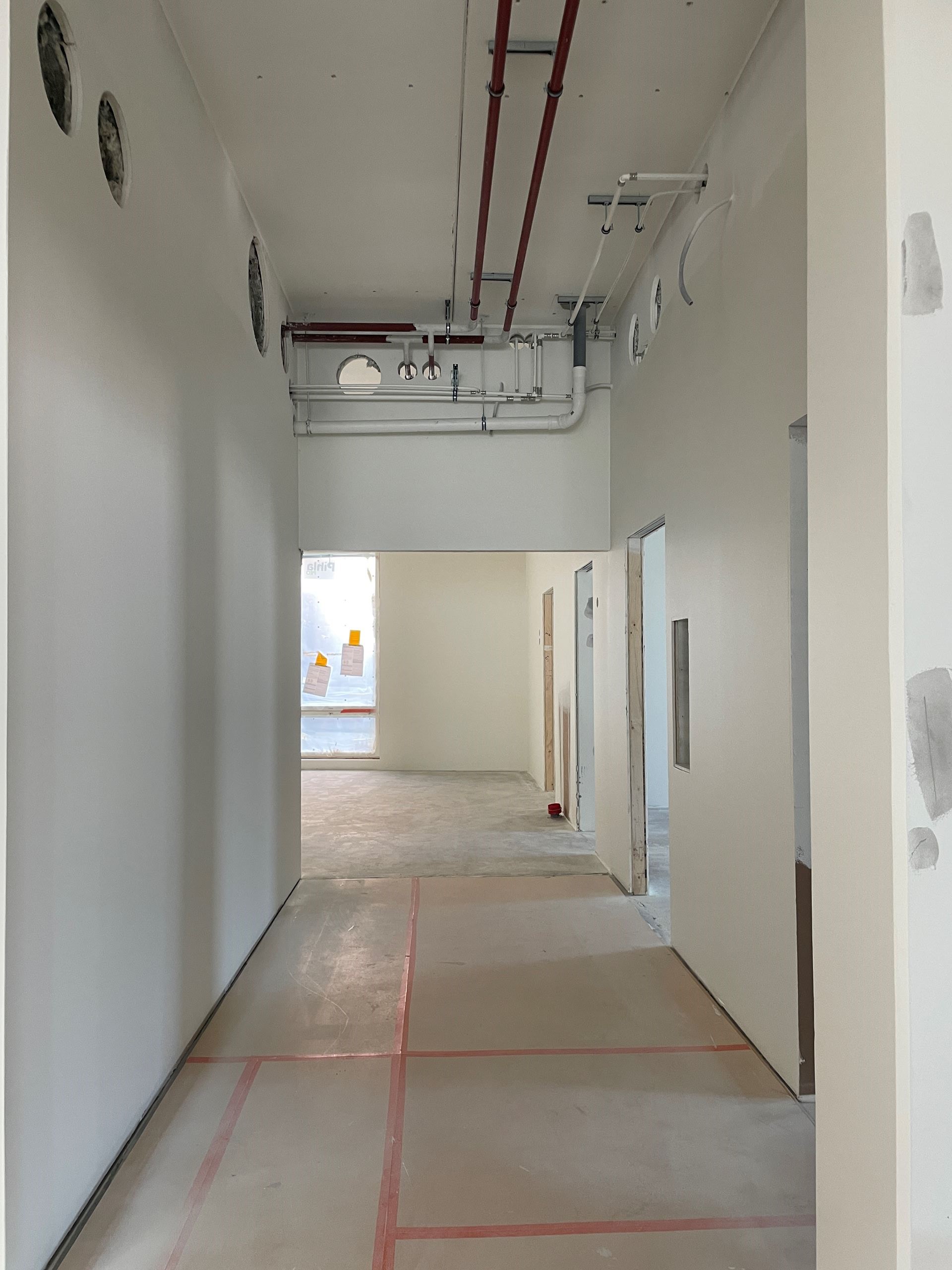 Inne i byggnaden är gjutningen av betonggolv avslutad. Gipsväggar, puts- och målningsarbeten pågår på block D. Dessutom har golven i vindskanaler målats. Kakelarbeten i toaletterna och installationen av undertak fortsätter. I köket kylrum har installerats, och därefter har installationen av kylaggregat påbörjats.