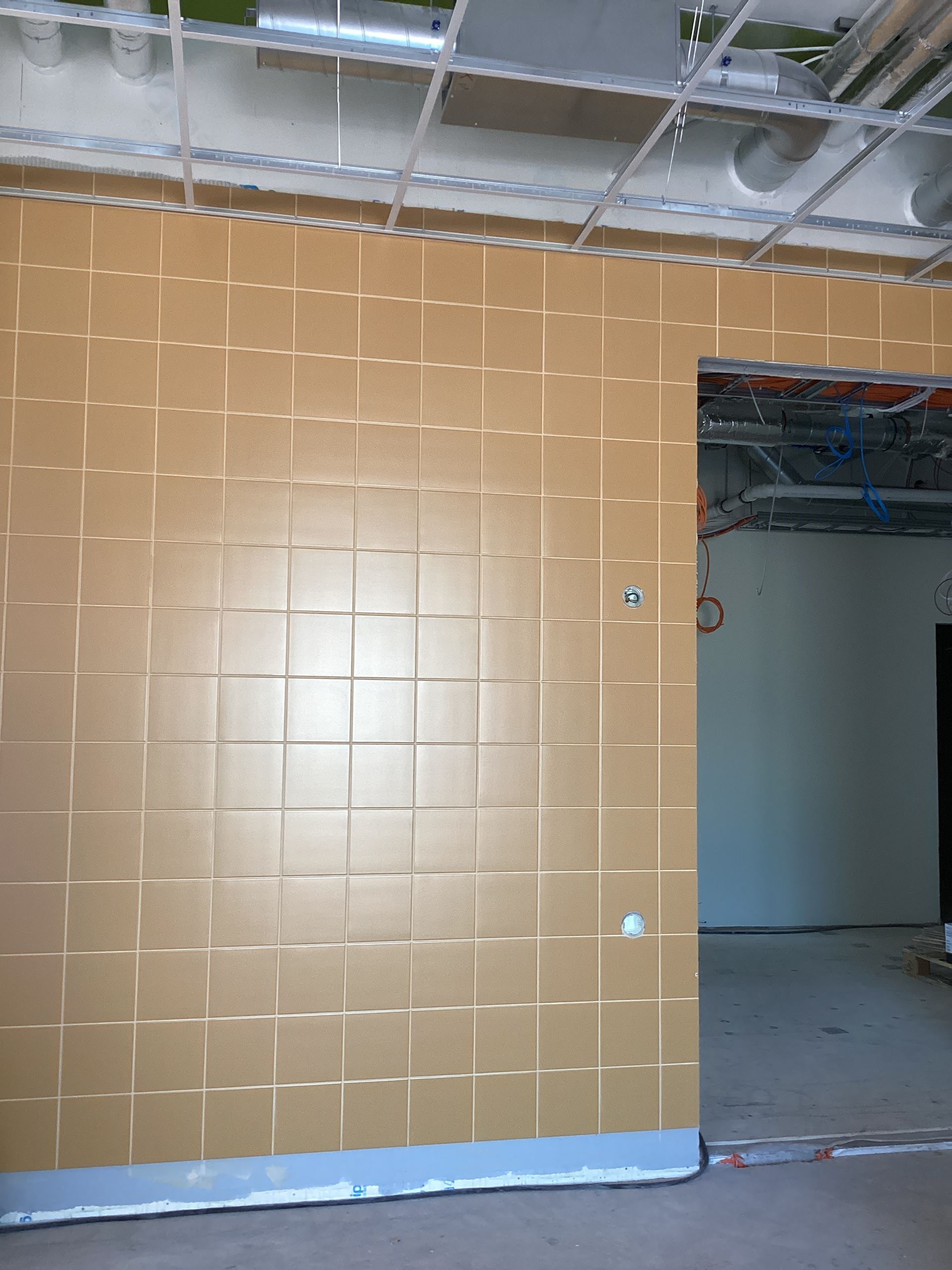 Rakennuksen sisällä pintabetonilattioiden valut ovat valmiit. Kipsiväliseinätyöt sekä tasoite- ja maalaustyöt ovat käynnissä mm. D-lohkolla. Lisäksi ullakon kanavatiloissa on maalattu lattioita. Laatoitustyöt WC-tiloissa ja alakattojen runkojen asennus jatkuvat. Keittiötiloissa on ensin asennettu kylmähuoneita, ja sen jälkeen on käynnistynyt kylmälaiteasennukset.