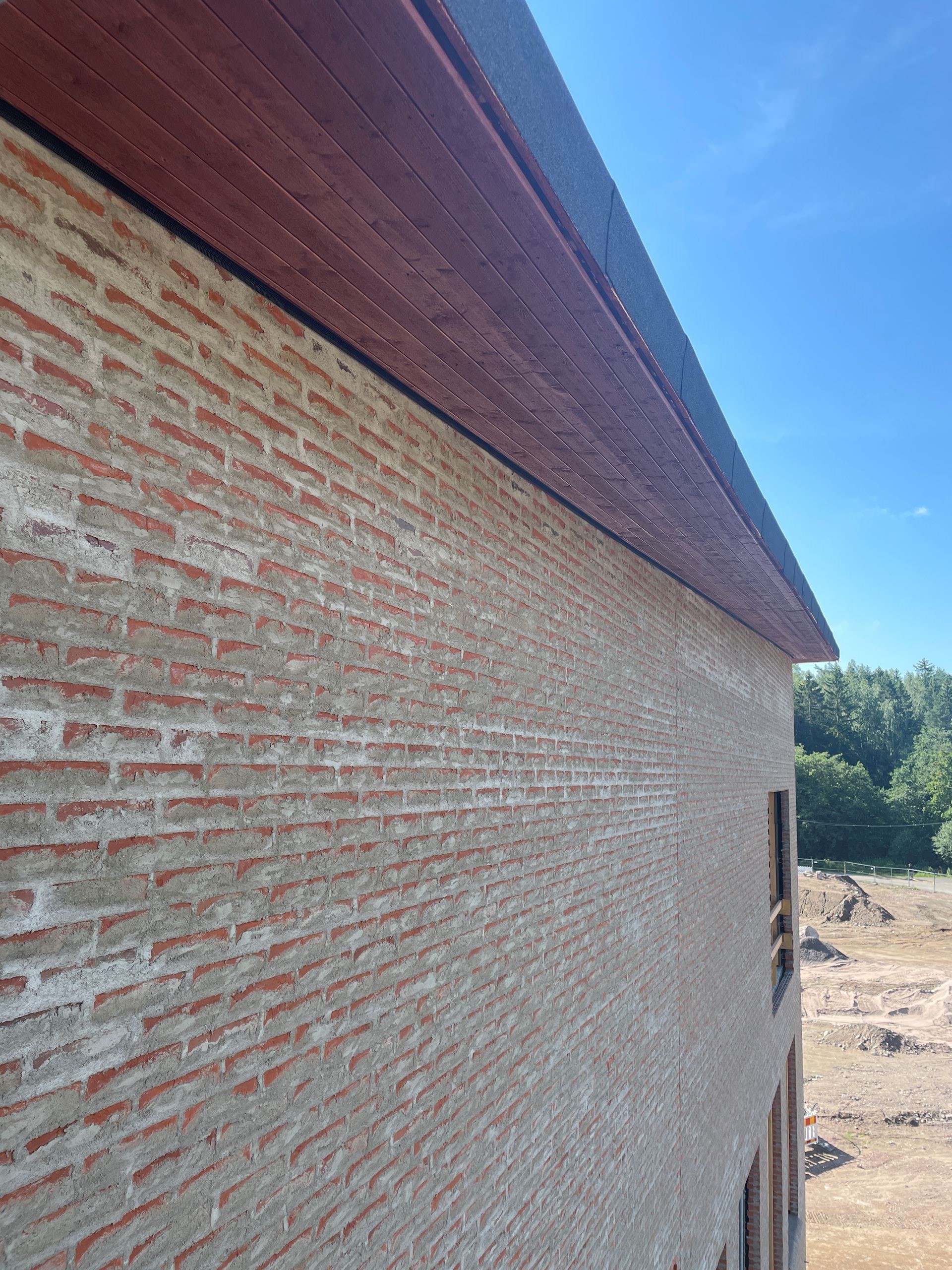 Måntering av takfilt är nästan färdig på taket. På utsidan pågår arbete med panel- och målningsarbeten för takfoten. Murningsarbetet på fasaden är i stort sett klart – för tillfället pågår avslutande arbeten. Ställningar har demonterats från fasadställningarna på block D och E. Dessutom har ställningar installerats för ljudisoleringsarbeten i musiksalen på första våningen. Fönsternas plåtarbete kommer att fortsätta i slutet av juli.