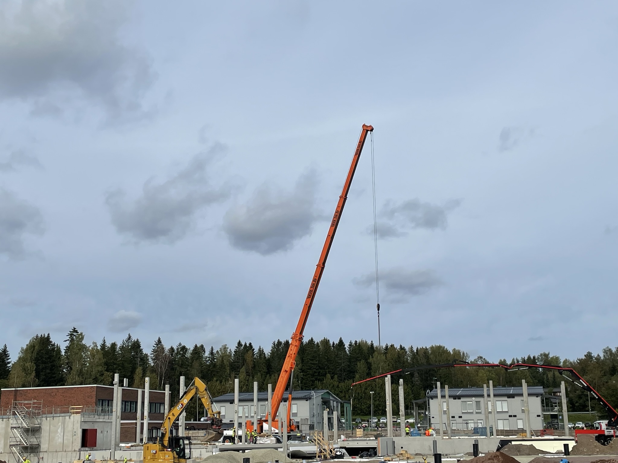 Muun rakennuksen elementtiasennus on alkanut A- ja F-lohkoilta eli pohjoisosasta. Kuvissa näkyy oranssi nosturi, jolla pilareita, onteloita ja muita elementtejä nostetaan paikoilleen.