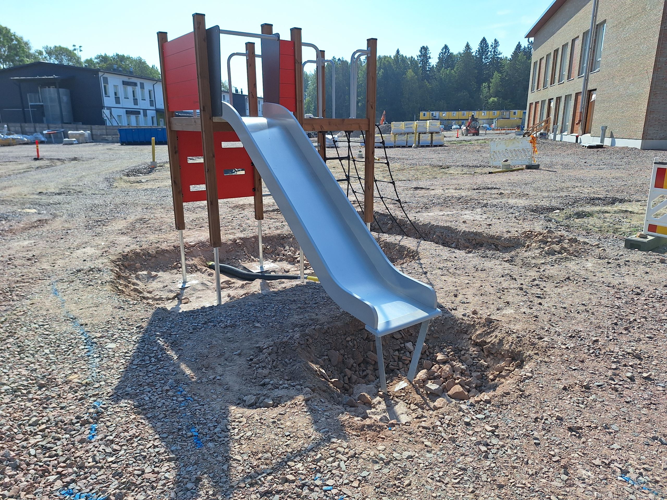 Ulkopuolella käynnissä olevia töitä ovat peltityöt sekä teräsulko-ovien asennukset. Julkisivulasiseinät on asennettu paikoilleen. Maanrakennustöissä tehdään hulevesikosteikkoa työmaa-alueen kaakkoiskulmassa, profilointia ja ulkopuolista tekniikkaa. Pihatyöt ovat myös käynnissä: sisäänkäyntien luona on asennettu betonikiveyksiä. Lisäksi leikkivälineiden ja aitojen asennus on aloitettu Papinmäen ulkopuolella (A-lohko).