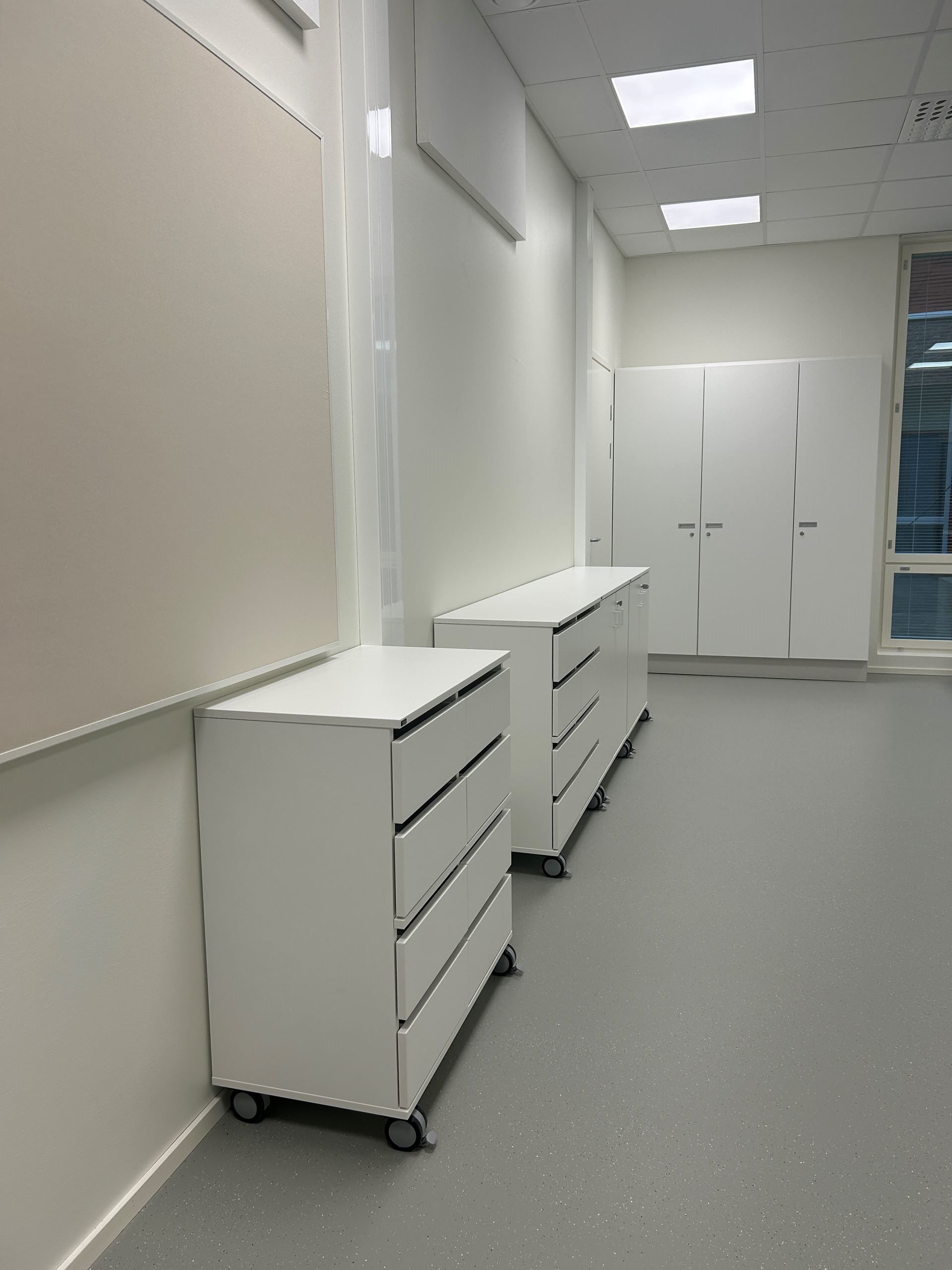 Tilaajan kalustustyöt etenevät, paikoilleen on asennettu mm. laatikostoja ja pulpetteja. Lisäksi kuntosalikalusteita on asennettu. Kalustus jatkuu koko syys-lokakuun ajan.