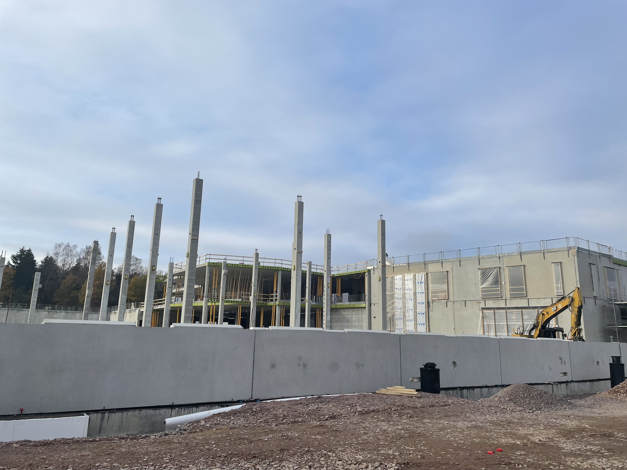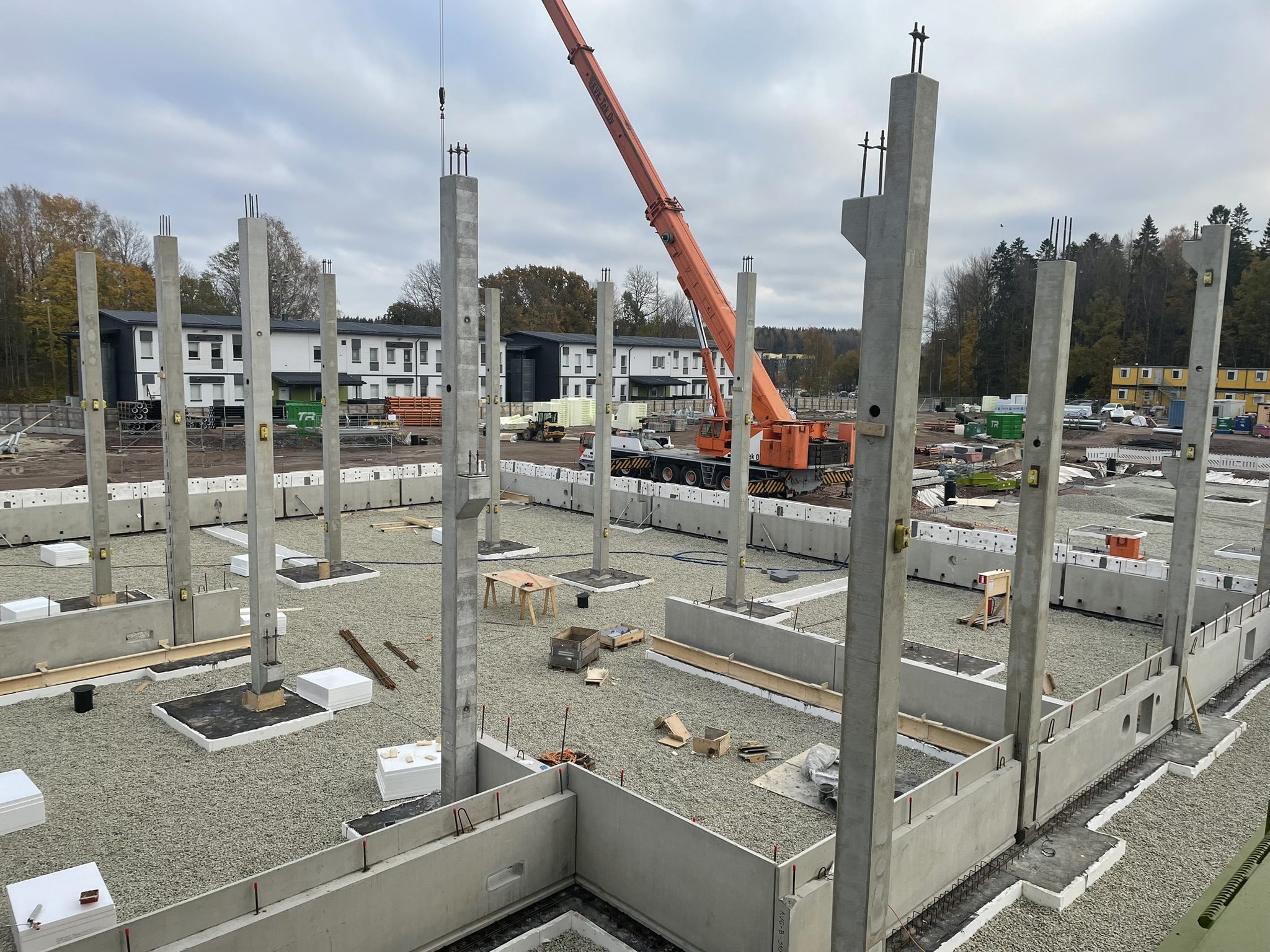 A- ja F-lohkoilla elementtiasennus on valmis – rakennuksessa on näillä lohkoilla kaikki elementit molemmista kerroksista asennettu. Ensimmäiset ikkunat asennetaan näille lohkoille marraskuun aikana. Elementtiasennustyöt ovat siirtyneet B- ja E-lohkoille.