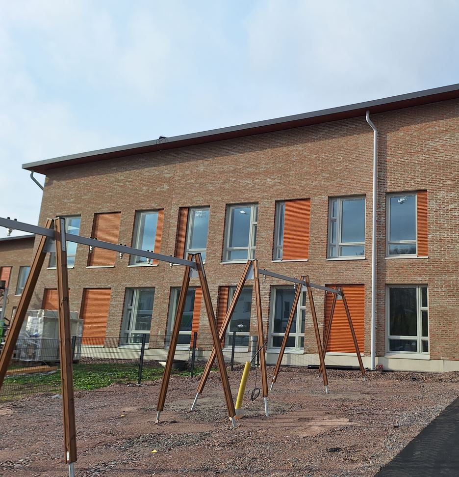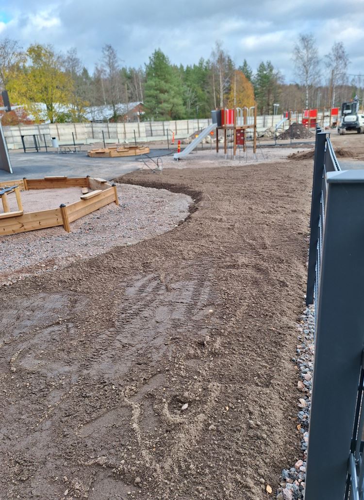 Pågående arbeten utanför är installationer av ståldörrar och plåtarbeten. På gårdsområdena framskrider installation av lekredskap, jordarbeten och betongstensläggning. Dessutom pågår arbeten med skärmtak och gårdsförråd. Nya arbetsmoment som har påbörjats är installation av blåsull i vindsutrymmena och asfalteringsarbeten på västra sidan av byggnaden.