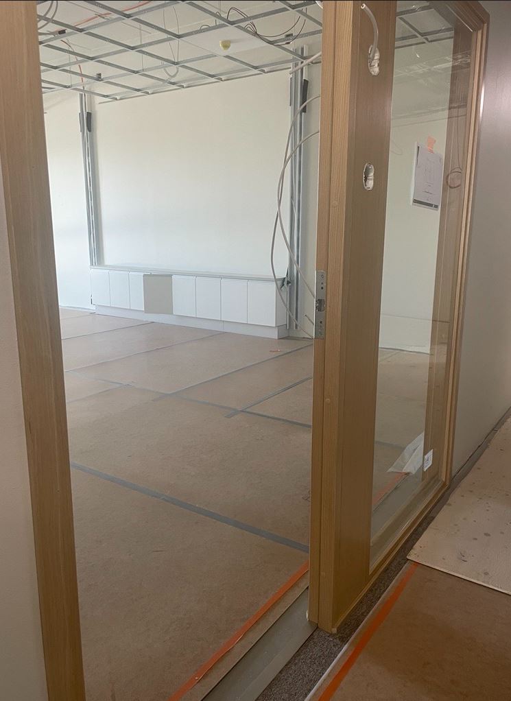 Inuti i byggnaden fortsätter målningsarbeten, undertaksinstallation och möbelinstallation. Golvbeläggning har senast gjorts i mattfördjupningar vid entréerna på första våningen. Installation av innerdörrar pågår, och dörrar har satts på plats bland annat i personalutrymmen och Prästgårdsbackens A-sektion. Låssystemet installeras efter att dörrarna har monterats. Golvlistarbeten har påbörjats.