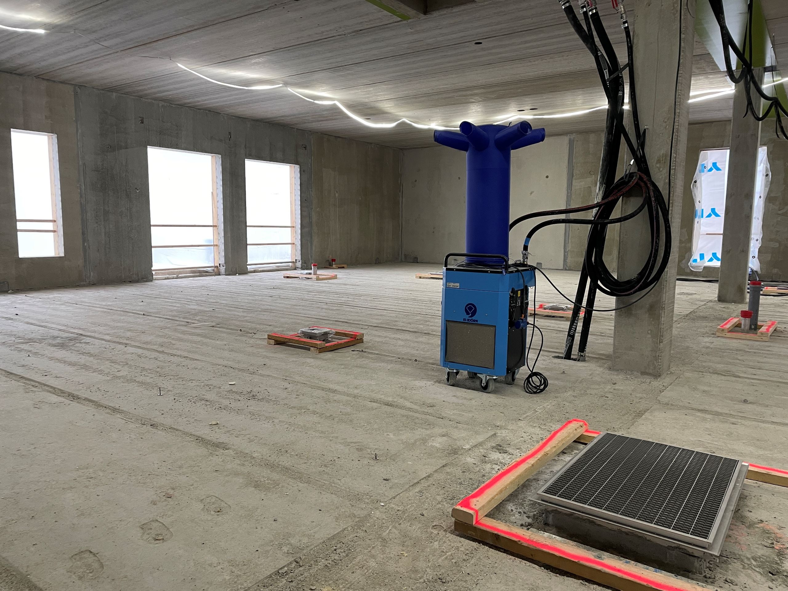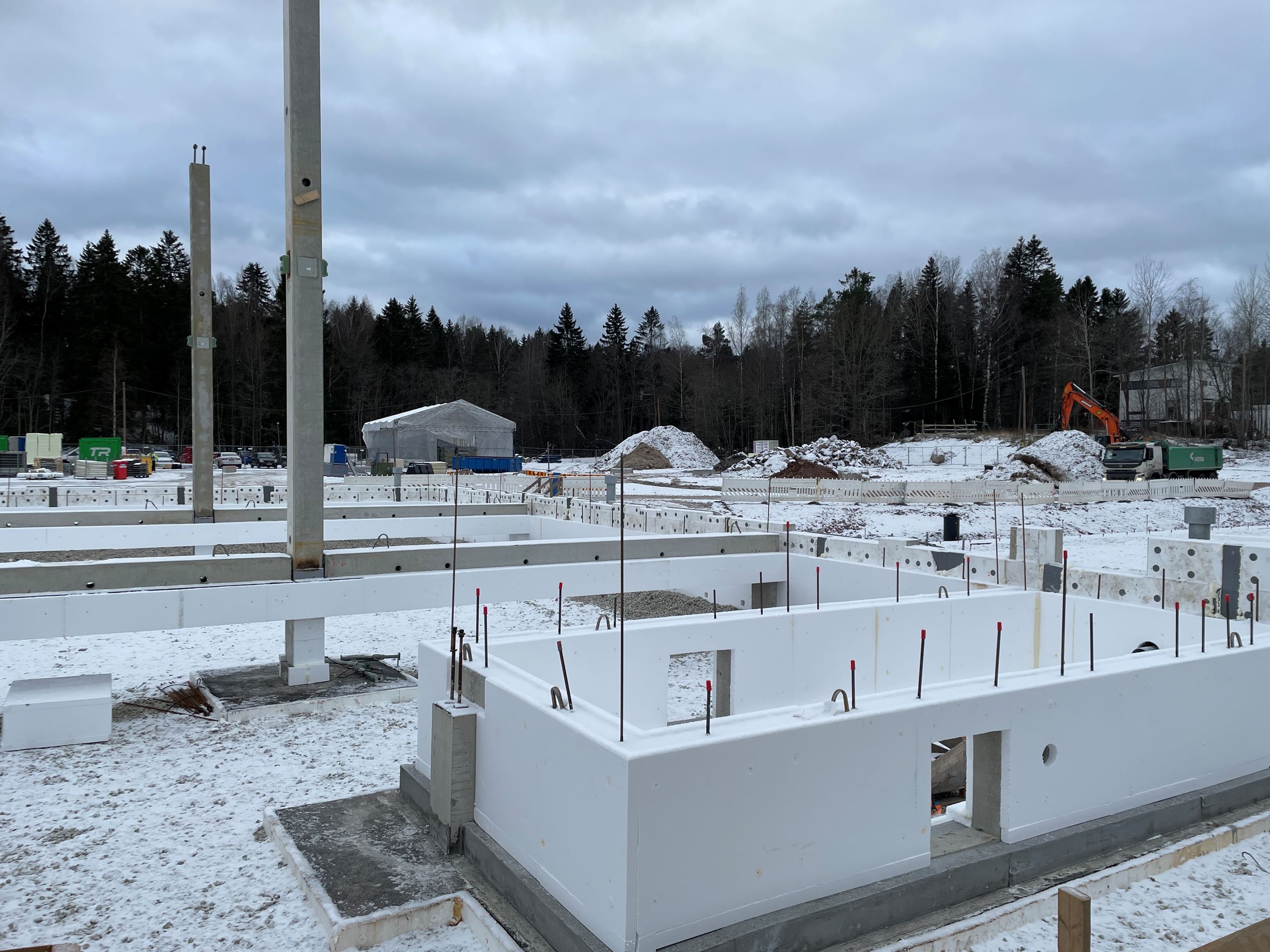 Betonielementit on asennettu A- ja F-lohkoilla, ja tällä hetkellä asennukset ovat käynnissä B-, C- ja E-lohkoilla. Vesikatolla höyrynsulkukermitys on valmis A- ja F-lohkoilla. Lisäksi vesikaton puutyöt ovat alkaneet – ulkoseinäelementtien asennus on käynnissä, ja seuraavaksi asennetaan kattoelementtejä.