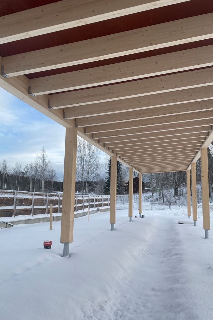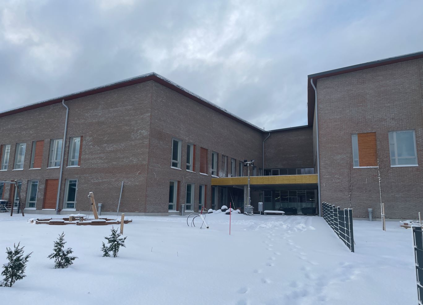 Arbeten som pågår utanför byggnaden inkluderar plåtarbeten samt arbeten med skärmtak och gårdsförråd. Gårdsarbeten, såsom installation av betongstenar, fortsätter när väderförhållandena tillåter det. Planteringar har också gjorts under hösten i utomhusområdena. Största delen av gårdens gångvägar asfalterades i oktober-november. Asfalteringsarbeten fortsätter nästa år. Installation av blåsull i vindsutrymmena är klar.