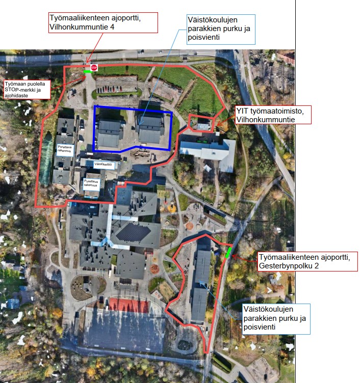 YIT:n työalueet sijaitsevat väistökoulujen poisviennin jälkeen kahdessa paikassa: Wiggen pohjoispuolella (Vilhonkummuntie) ja itäpuolella (Gesterbynpolku). Molemmilla alueilla on ajoportit työmaaliikennettä varten. Kevyen liikenteen väylillä liikkuvilta pyydämme erityistä varovaisuutta.