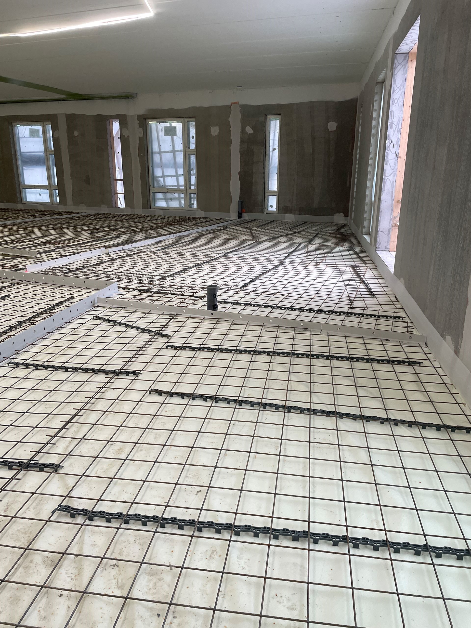 Rakennuksen sisällä töitä tehdään A- ja F-lohkoilla molemmissa kerroksissa. Käynnissä on muun muassa väliseinämuurauksia, pölynsidontamaalausta ja pintabetonilattioiden valmistelua. Ensimmäinen pintabetonilattiavalu toteutettiin tällä viikolla. Lisäksi ikkunoita on asennettu paikoilleen.