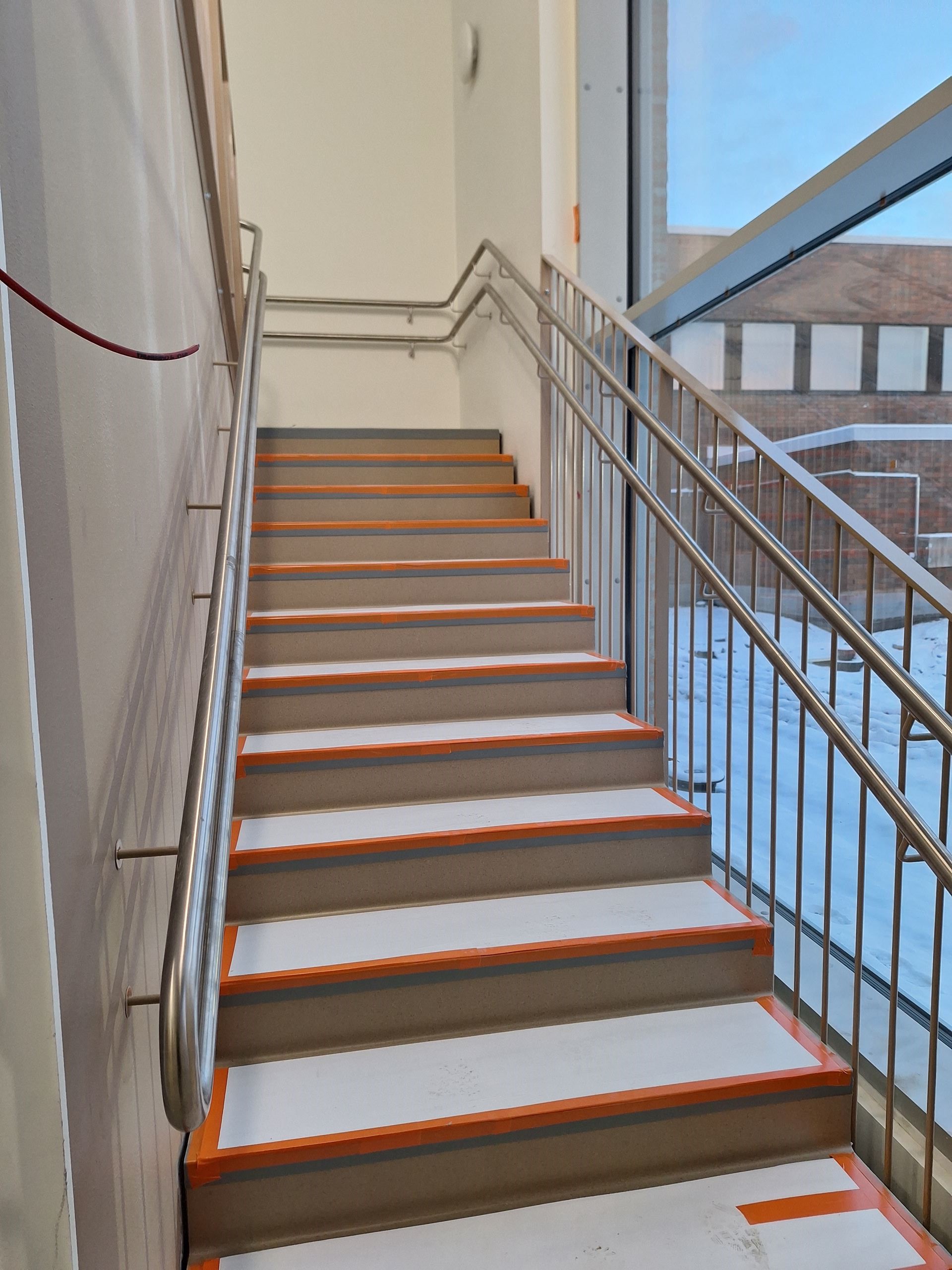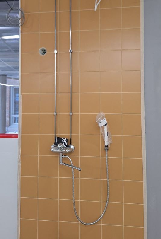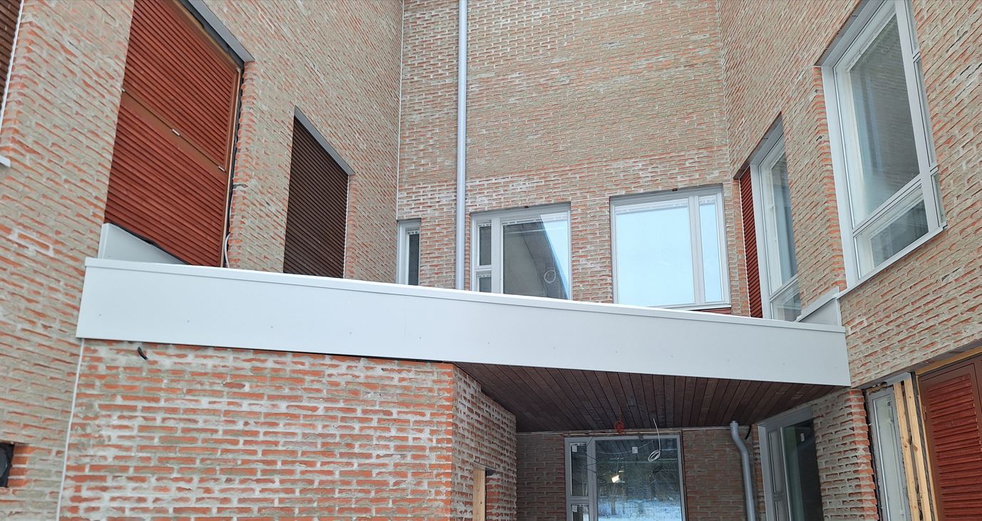 Utanför byggnaden pågår arbete med skärmtak och gårdsförråd. Detta inkluderar bland annat murningsarbete och täckning. Dörrarna till gårdsförråden börjar installeras i januari.