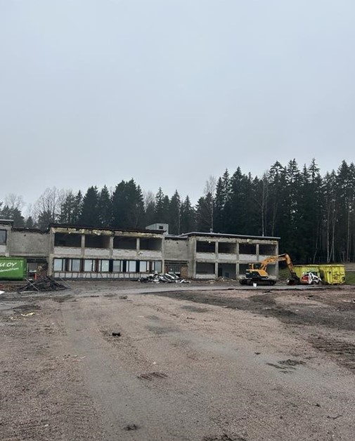 Rivningsarbetena fortsätter på byggarbetsplatsen. Invändiga rivningar i de två byggnader som ska rivas är färdiga. Dessutom har tegelfasaderna demonterats. Rivning av stom- och skalstrukturer (så kallad tung rivning) har påbörjats i den gamla gymnastiksalen. Vårt projekt har beviljats bullertillstånd som gäller från 1.12.2025 till 30.4.2026. Enligt tillståndet får omfattande rivningsarbeten, packning och krossning av betong- och tegelavfall samt småskalig sprängning utföras vardagar kl. 7–20 och lördagar kl. 8–16, med undantag för helgdagar och högtider. Vi beklagar det buller som arbetet orsakar!