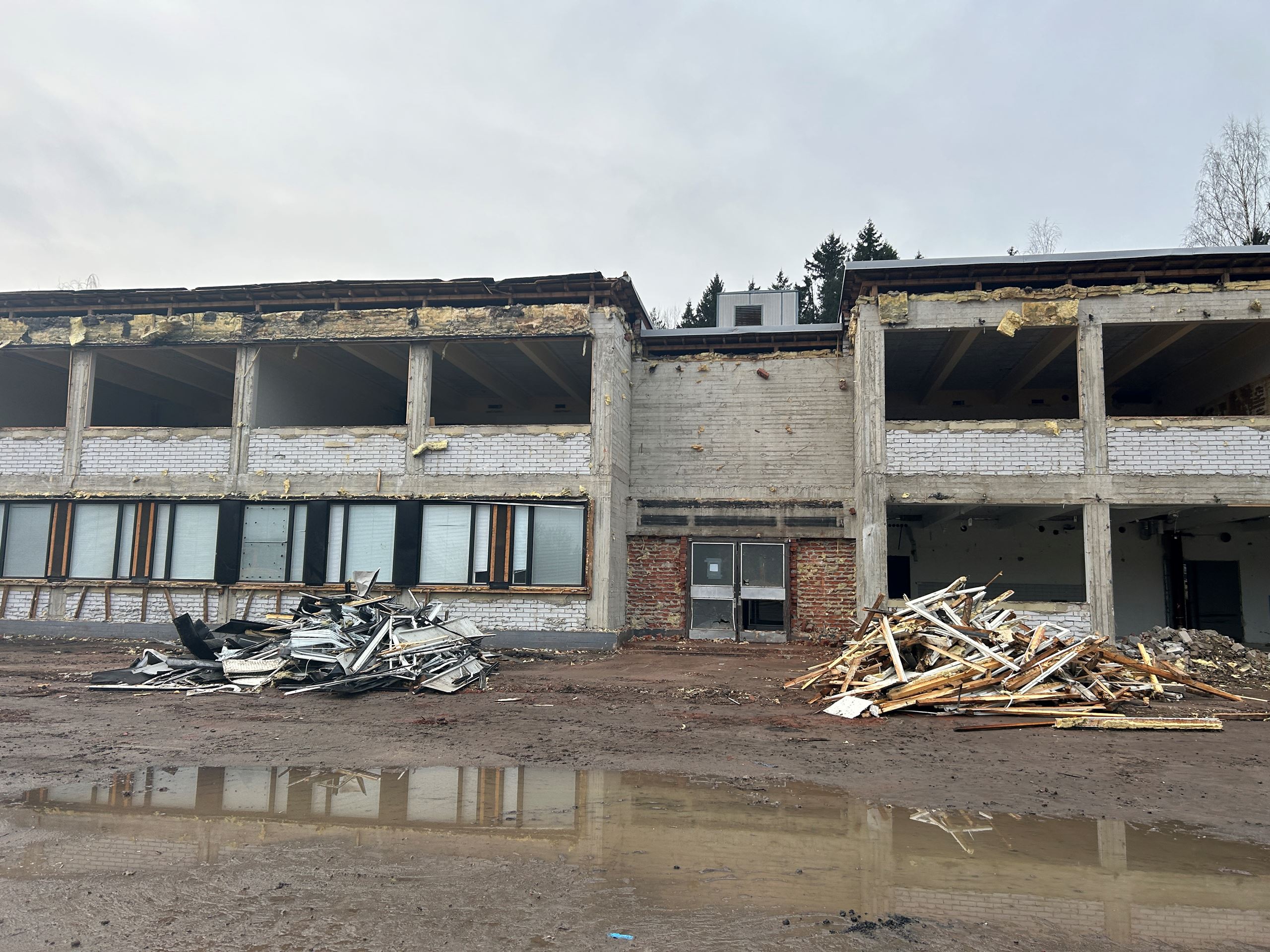 Purkutyöt jatkuvat työmaalla. Kahden purettavan rakennuksen sisäpurut ja julkisivujen tiilimuurausten purut on saatu valmiiksi. Runko- ja kuorirakenteiden purku (ns. raskaspurku) on aloitettu vanhasta liikuntasalista. Kohteellemme on myönnetty melulupa, joka on voimassa ajalla 1.12.2025 - 30.4.2026. Sen mukaisesti massiivipurkutöitä, betoni- ja tiilijätteen rammerointia ja murskausta sekä pienimuotoista louhintaa voidaan tehdä arkisin klo 7-20 ja lauantaisin klo 8-16, pois lukien arkipyhät ja juhlapäivät. Pahoittelemme töistä aiheutuvaa meluhaittaa!