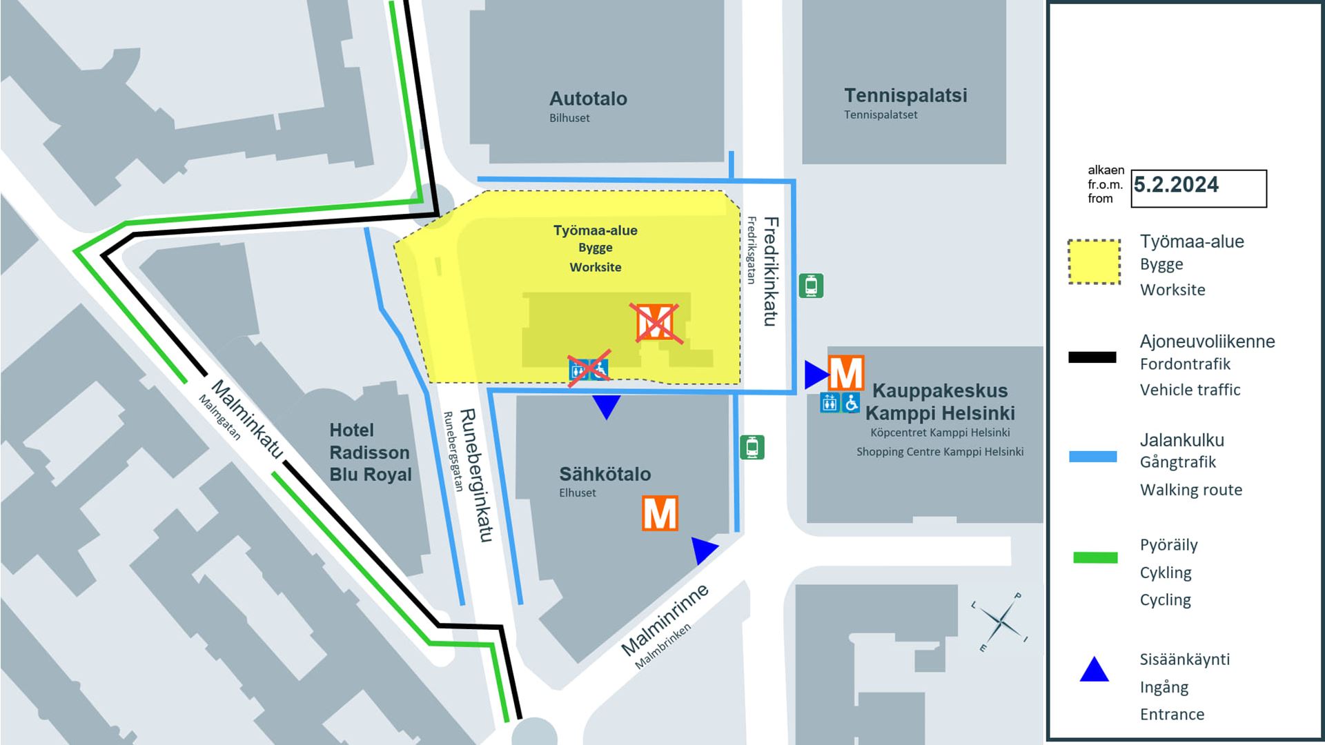 Kampin metroaseman lippuhalli suljetaan kokonaan 5.2.2024 alkaen, kun myös nyt käytössä ollut hissiyhteys poistuu käytöstä. Kaikki kulkeminen metroon tapahtuu jatkossa kauppakeskus Kampin kautta. Korvaavat hissit ja liukuporras sijaitsevat kauppakeskuksen E-tasolla. Kauppakeskuksen E-tasolle pääsee Fredrikinkadun puoleisesta sisäänkäynnistä tai Sähkötalon Malminrinteen puoleisesta sisäänkäynnistä.