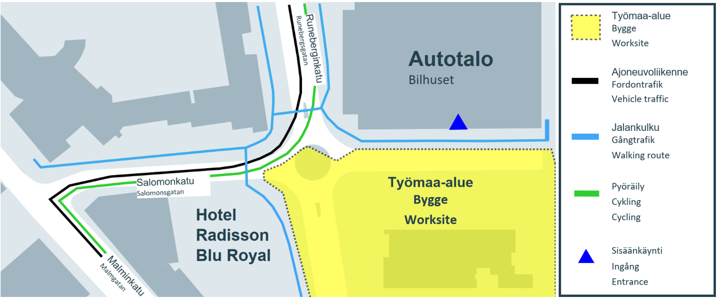 Kamppiin rakennettavan uuden terveys- ja hyvinvointikeskuksen rakennustyöt ovat edenneet suunnitelmien mukaisessa aikataulussa. Seuraavassa vaiheessa siirrymme rakentamaan terveyskeskukselle uutta maanalaista huoltoajoyhteyttä. Maanalaisten töiden takia Runeberginkadun ja Salomonkadun risteyksen kohdalla ajotietä sekä jalkakäytävää kavennetaan 8.4.2024 alkaen.