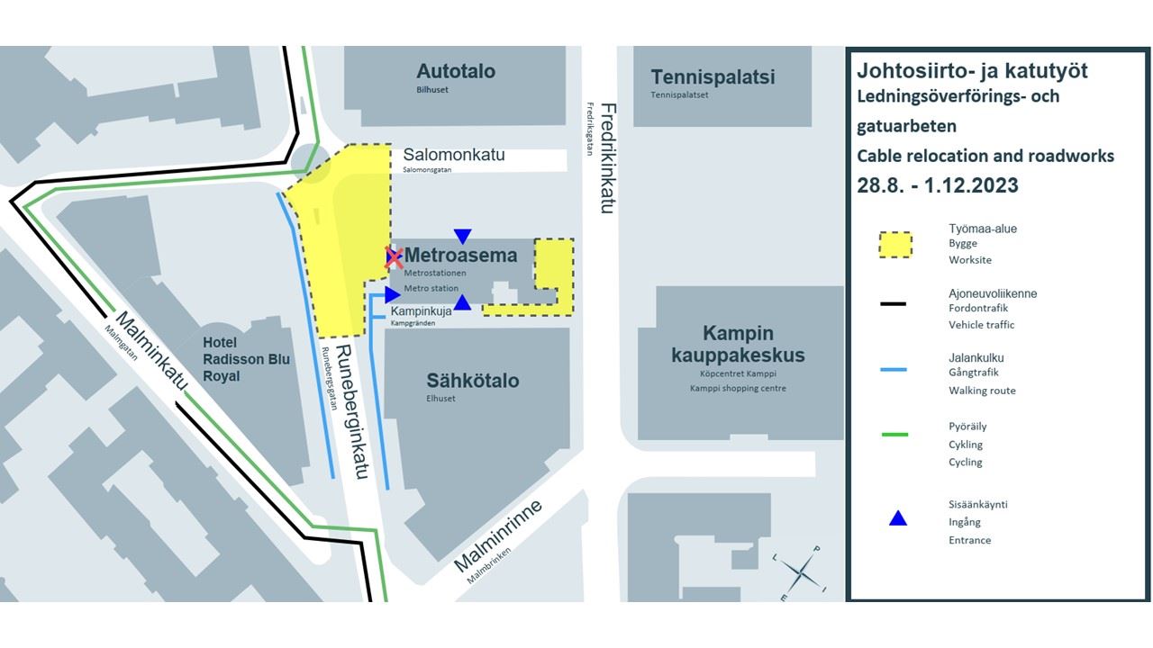 Kamppiin rakennettavan uuden terveys- ja hyvinvointikeskuksen edellyttämät johtosiirto- ja katutyöt ovat edenneet suunnitelmien mukaisessa aikataulussa. Seuraavassa vaiheessa siirrymme työskentelemään Runeberginkadulle. Tästä johtuen Runeberginkatu suljetaan auto- ja pyöräliikenteeltä Salomonkadun ja Kampinkujan väliltä 28.8.2023 alkaen. Jalankulkijoiden kulku työmaa-alueen ohi säilyy Runeberginkadulla.
