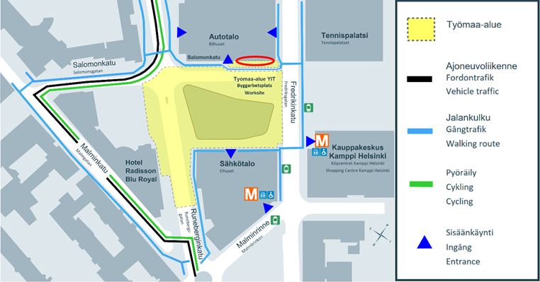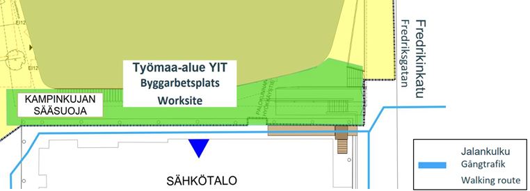 - Sähkötalon pääsisäänkäynti ja jalankulku Kampinkujalla säilyvät ennallaan töiden aikana.