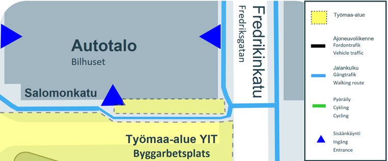 - Jalankulkureitit Autotalon edustalla muuttuvat. Jalankulkureitti kapenee, mutta jalankulku Salomonkadun suuntaisesti pysyy auki töiden aikana.