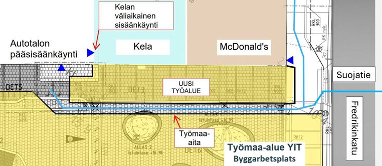 Työalue: Autotalon pääsisäänkäynnin ja Fredrikinkadun välinen alue