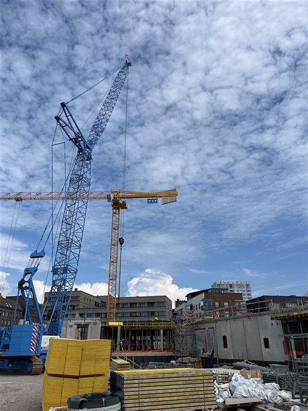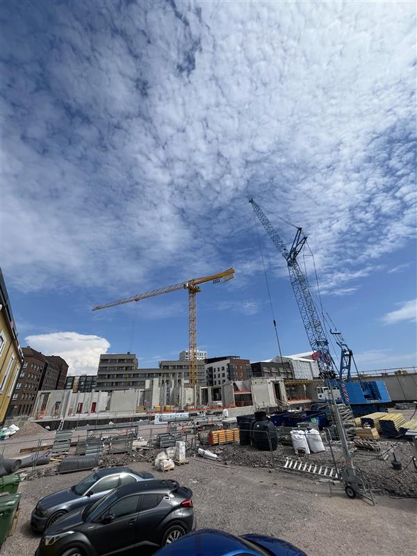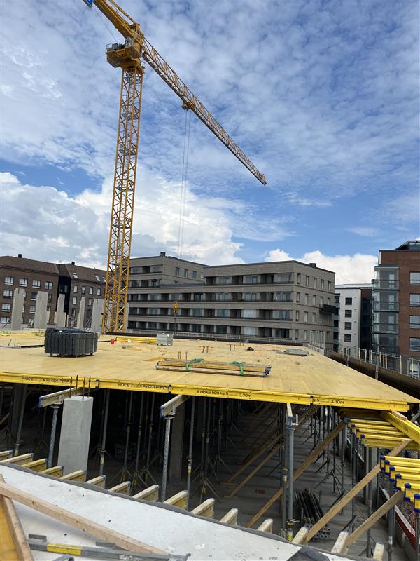 Kohteen rakennustyöt etenevät runkotöillä. Rungon seinäelementtien asennukset ovat käynnissä. 1. Kerroksen paikallavaluholvi on jännitetty ja valettu ensimmäisen lohkon osalta. Toisella lohkolla paikallavaluholvin muotti- ja raudoitustyöt ovat käynnissä.