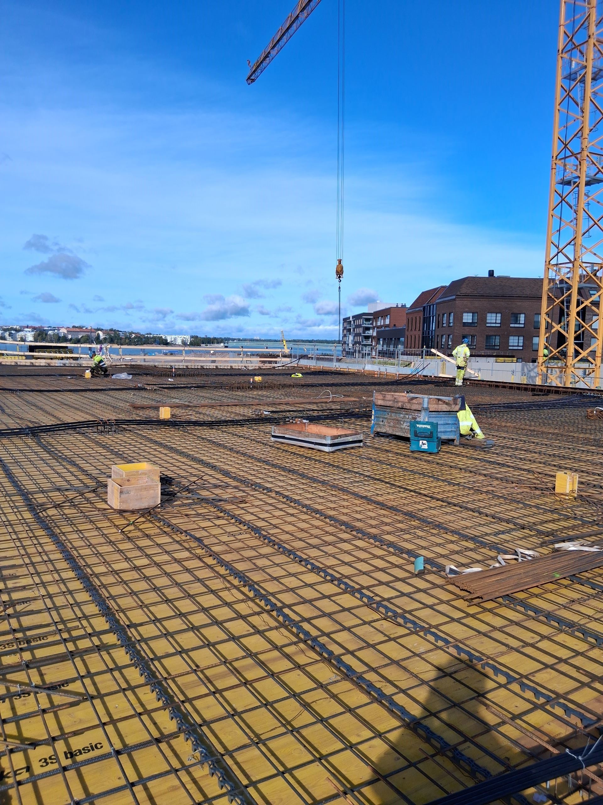 Paikallavaluholvin muotti- ja raudoitustyöt ovat käynnissä toisessa kerroksessa toisella ja kolmannella lohkolla. Ensimmäisellä lohkolla tehdään sääsuojan asennuksia sekä sisäpuolella kivirakenteisten väliseinien asennuksia.