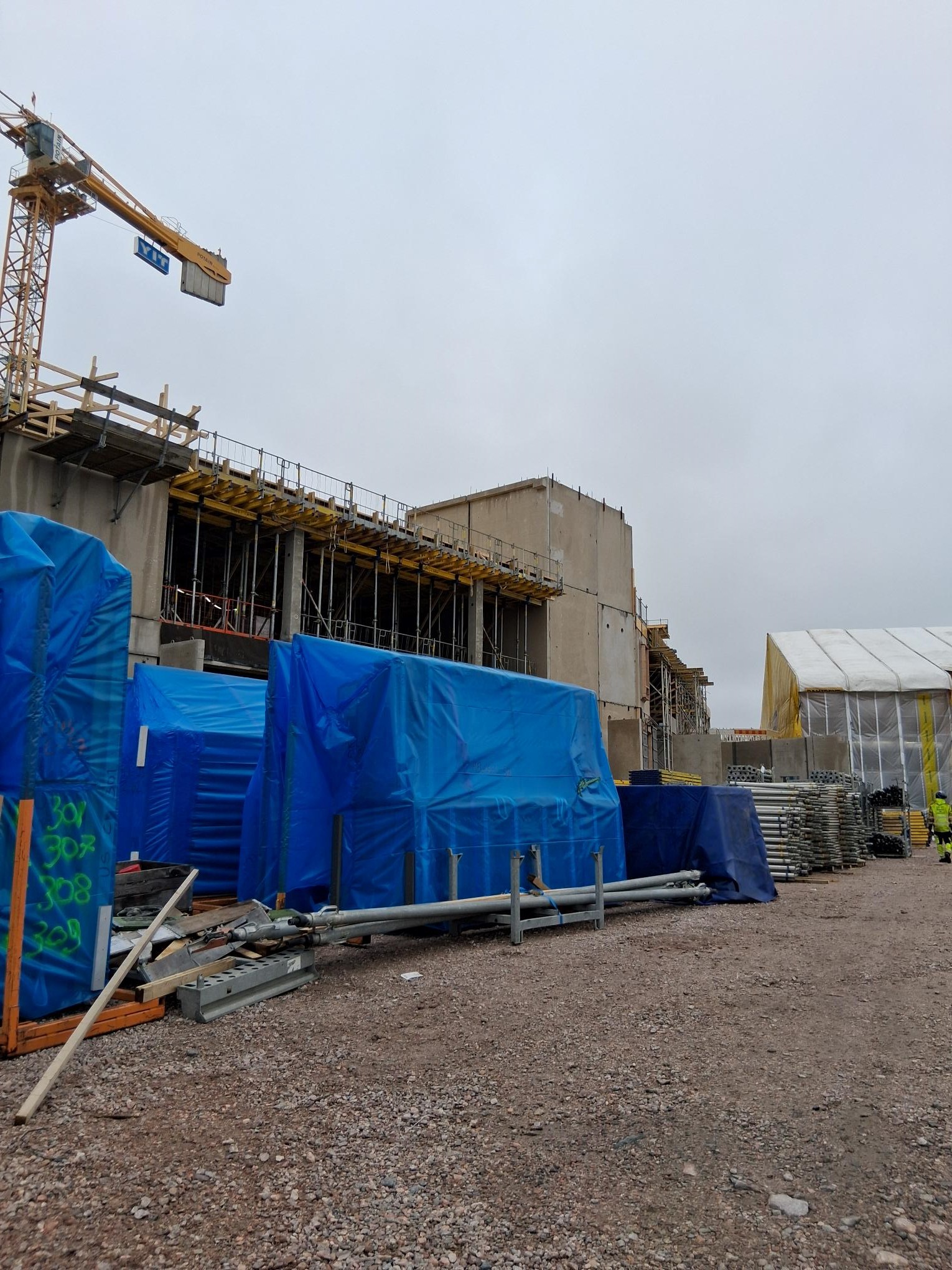 Kohteen rakennustyöt etenevät runkotöillä rakennuksen kolmannella lohkolla. Julkisivulla käynnissä sadetakkipeltien asennus sekä muuraustyö. Rakennuksen sääsuojan rakentaminen on käynnissä. Myös puuelementtityöt jatkuvat vielä rakennuksen kolmannella lohkolla.