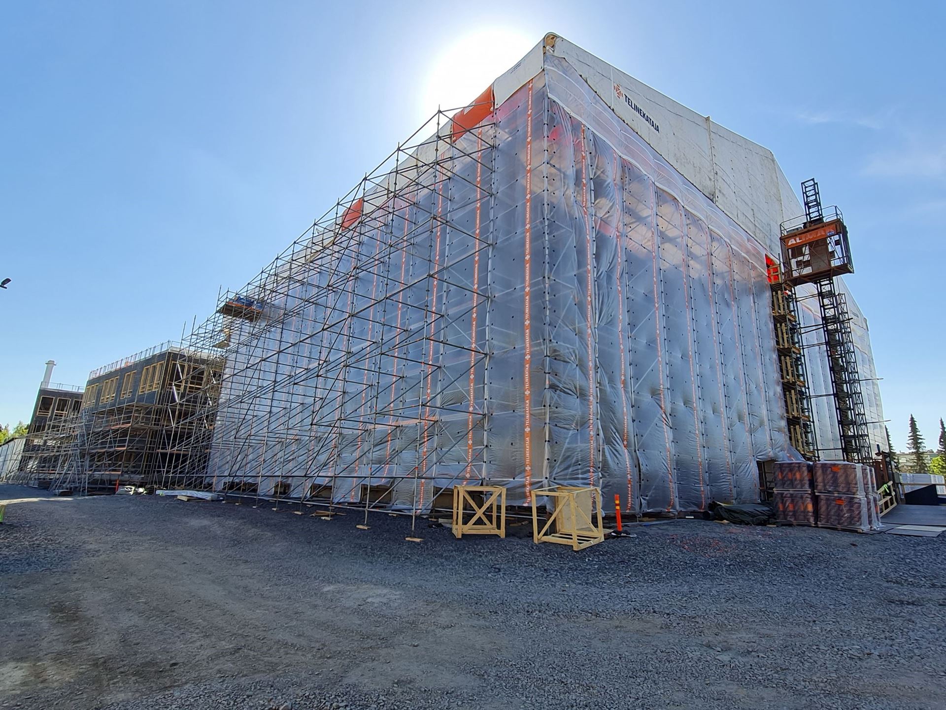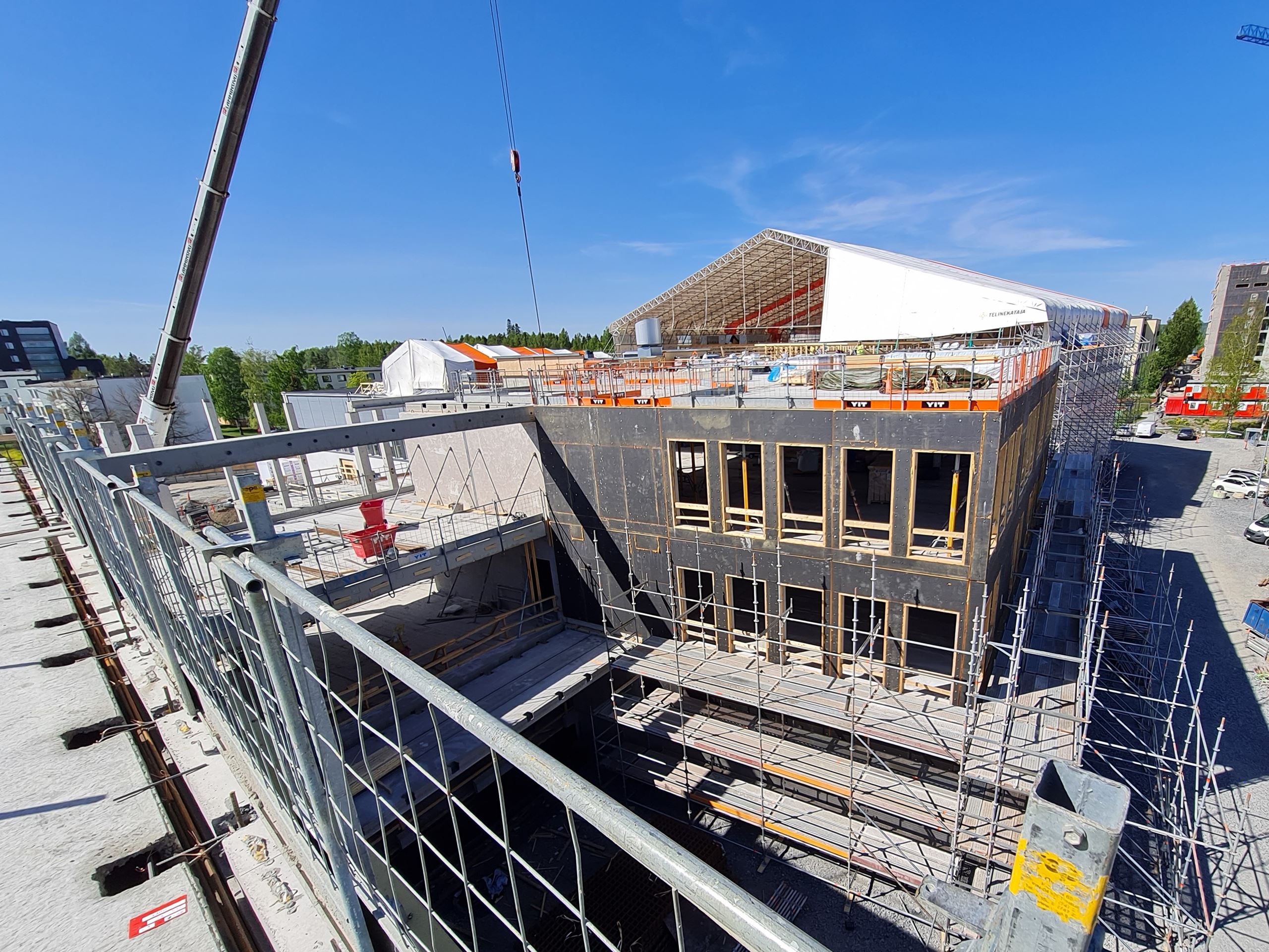 Pirkkala-kampuksen työmaalla rakennuksen betonirunkoa on saatu valmiiksi ensimmäisten lohkojen osalta. Viimeisten lohkojen osalta runkotyöt vielä jatkuvat kesän ja syksyn ajan. Myös sääsuoja nousee rakennuksen ympärille sitä mukaa kun runkoa on saatu valmiiksi.