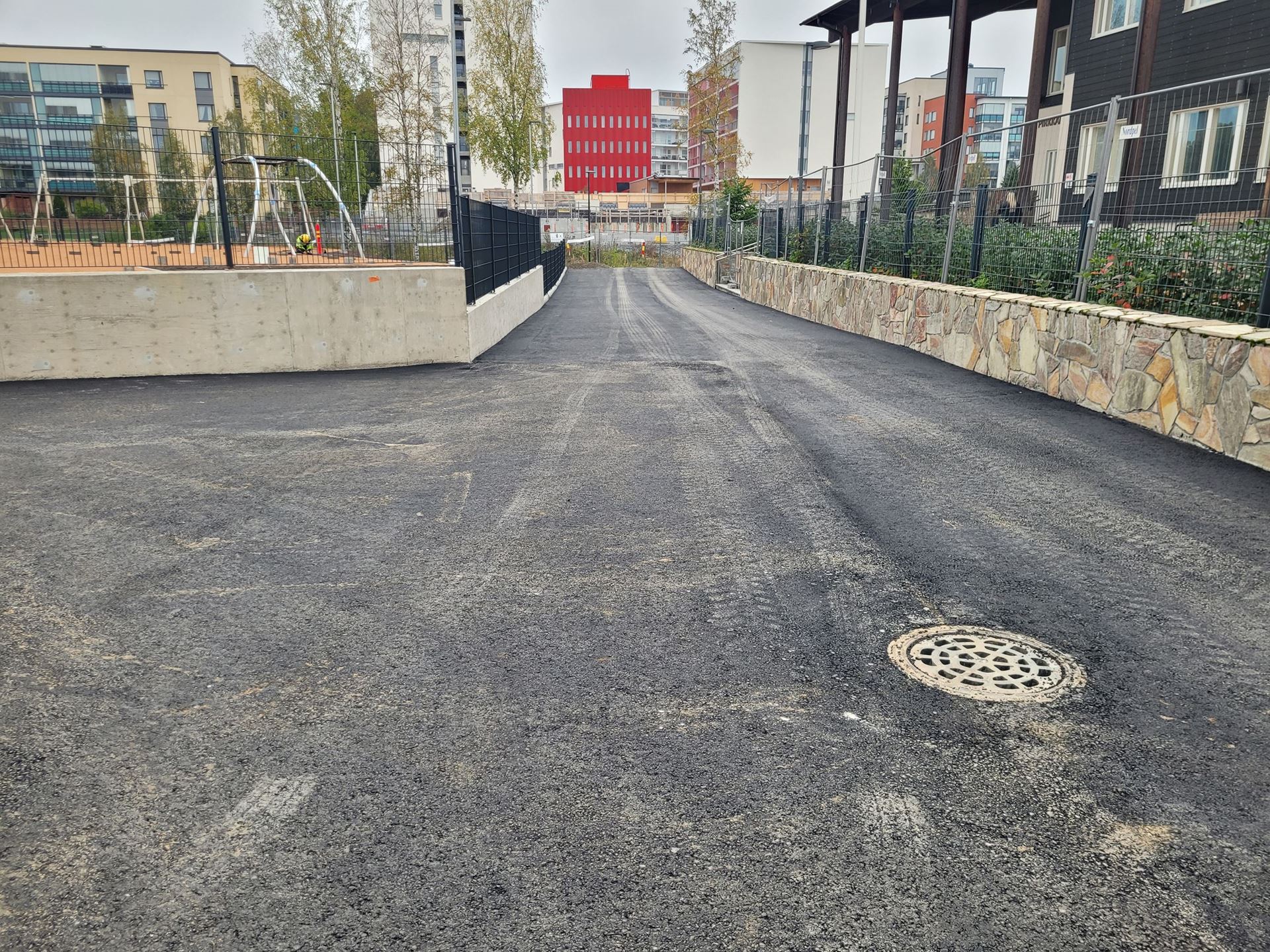 Pihan pohjoinen osuus on pääosin valmis ja istutustyöt ovat käynnissä. Pääoven eteen istutetaan pirkkalankoivu, joka opastaa jatkossa koulurakennuksen vierailijat Pirkkala-saliin erilaisiin tilaisuuksiin